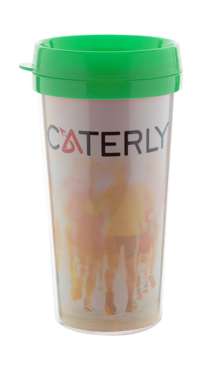 Plastový dvouvrstvý termo hrnek s otvorem na pití ve víčku. Logo lze umístit mezi stěny hrnku. Baleno v bílé papírové krabičce. Objem 450 ml.