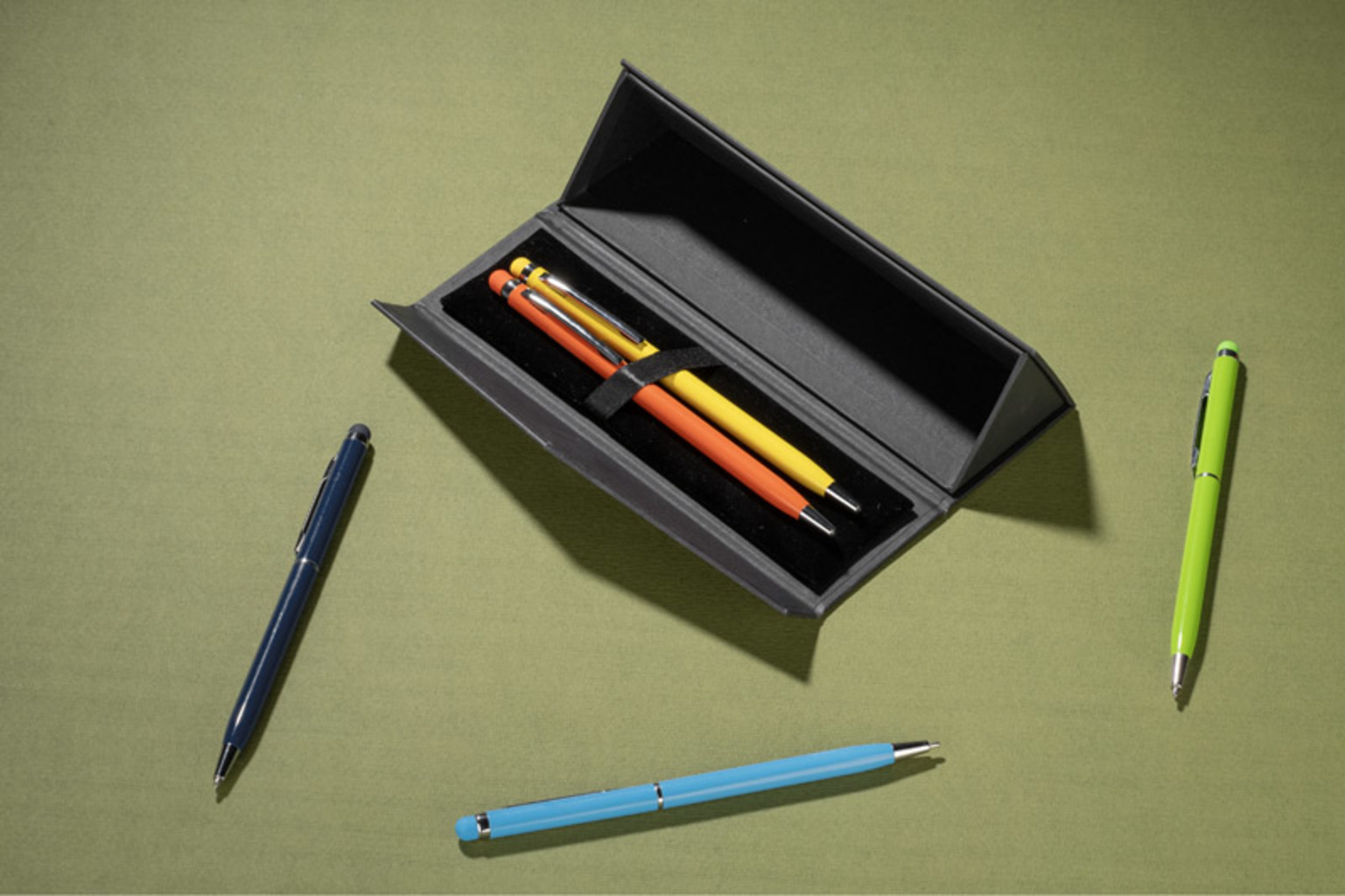 Stylové psací pouzdro jedinečného trojúhelníkového tvaru s magnetickým uzávěrem. Vnitřek je vyložen měkkým velurovým polštářkem, který poskytuje jemnou ochranu vašim oblíbeným psacím potřebám. Navíc je vybaveno praktickou stuhou na pero pro snadné a rychlé vyjmutí psacích potřeb. Pouzdro pojme jedno nebo až dvě pera, propisky nebo tužky.Je vyrobeno z ekologického papíru a představuje vynikající alternativu k tradičním pouzdrům ze syntetických materiálů. Ideální pro osobní použití i jako elegantní dárek.