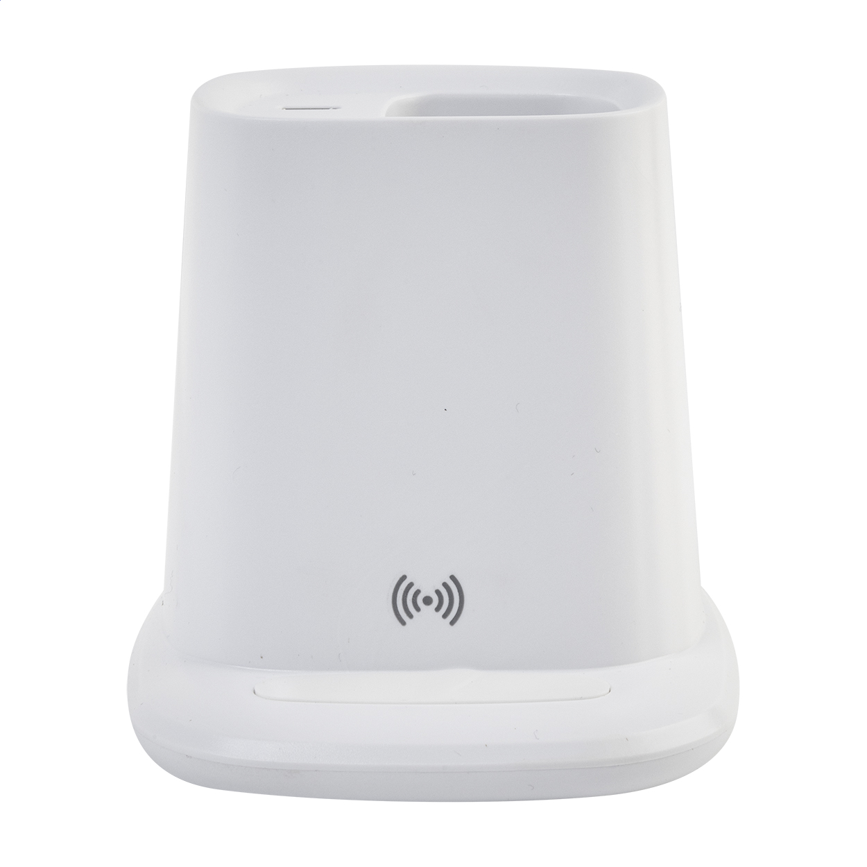 Multifunkční stojánek na pero z recyklovaného ABS plastu s držákem na mobil, vestavěnou bezdrátovou rychlonabíječkou (10 W), 1 USB a 1 USB-C portem pro nabíjení. Včetně USB kabelu pro nabíjení.