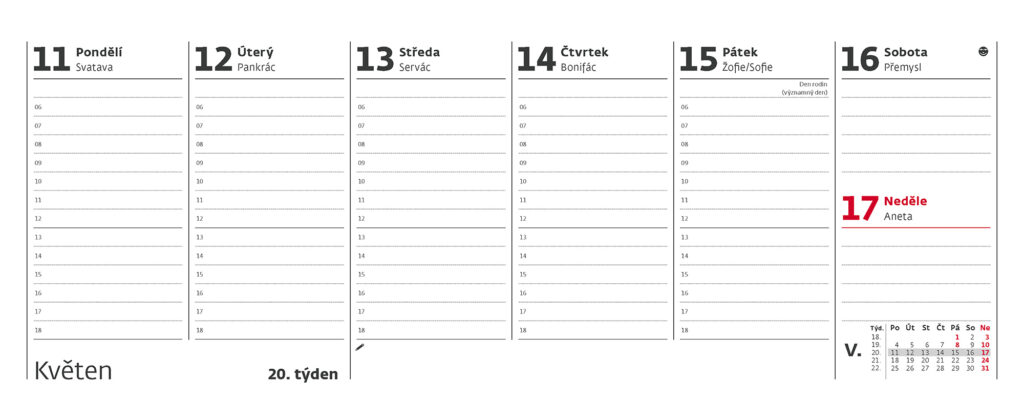 Formát kalendáře: 24,6 x 9,6 cm Kalendárium: české týdenní sloupcové Počet stran kalendáře: 56 + 2 Stojánek: s plným dnem Prostor pro přítisk: 24,6 x 3,5 cm + roční období, měsíční přehled