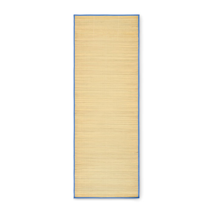 Plážová rohož z přírodní slámy s polyesterovým popruhem na nošení.