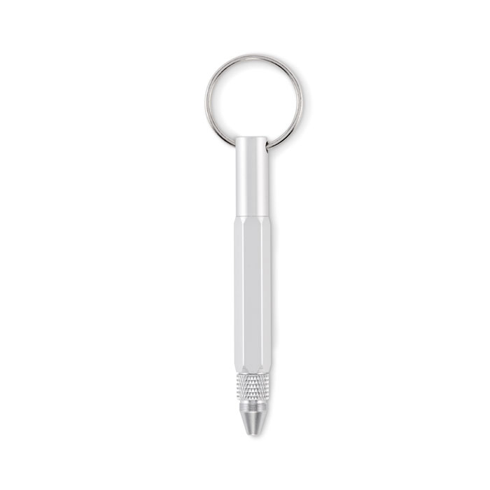 Přívěsek na klíče, propiska, pravítko 4 cm a 1,5 palce, stylus, křížový a plochý šroubovací bit 2v1. Černý inkoust. Vyrobeno z recyklovaného hliníku.