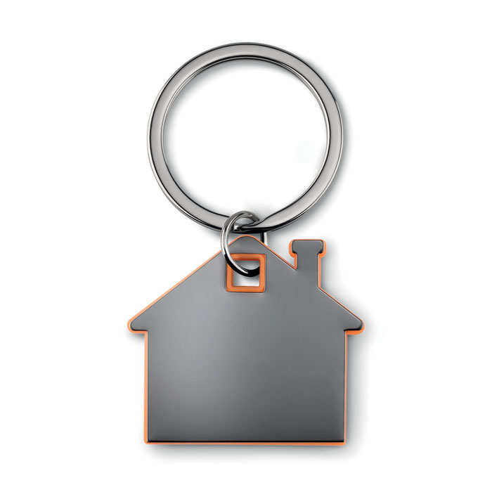 Přívěsek na klíče ve tvaru domu z nerezu a ABS plastu.