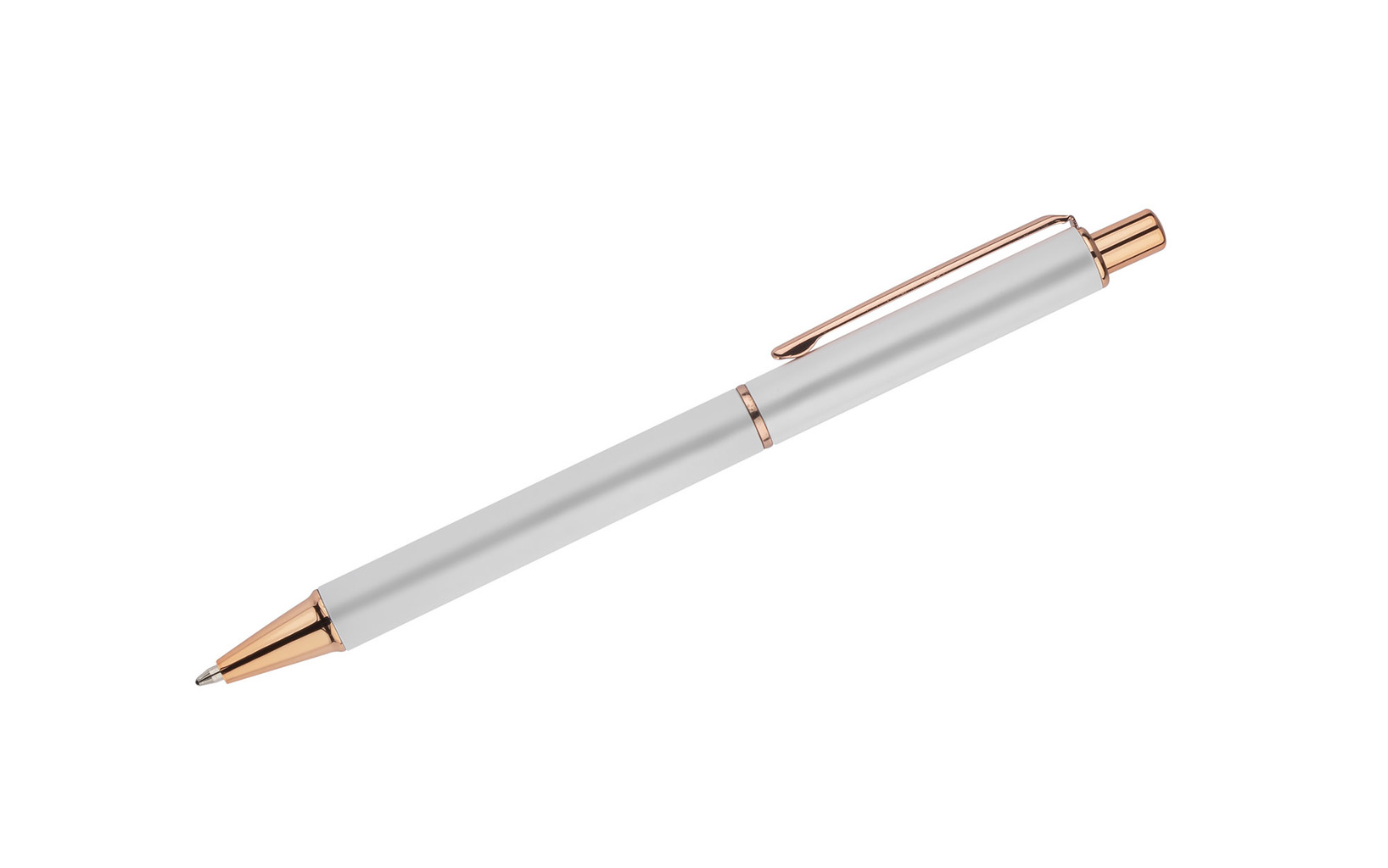 Matová propiska s akcenty v barvě růžového zlata. Těleso a klip jsou vyrobeny z kovu
