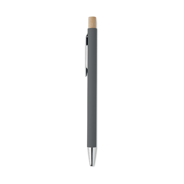Kuličkové pero z recyklovaného hliníku s bambusovým tlačítkem. Stříbrný hrot a klip. Modrý inkoust.