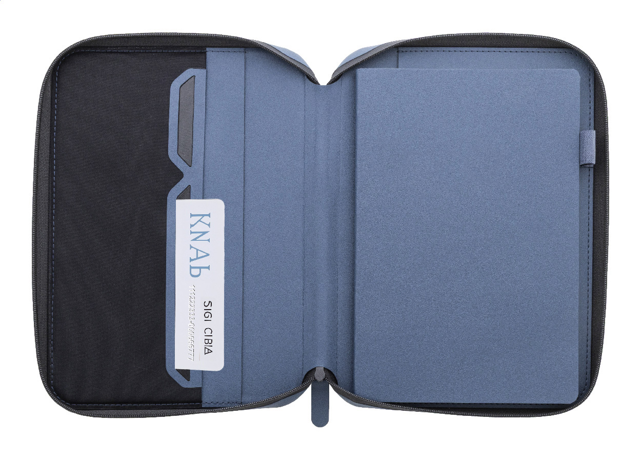 Luxusní složka na dokumenty A5 na zip z recyklované umělé kůže s 64 linkovanými listy a blokem z recyklovaného papíru. S několika vnitřními kapsami na karty a dokumenty.