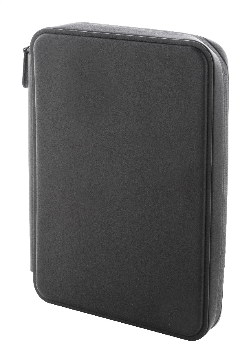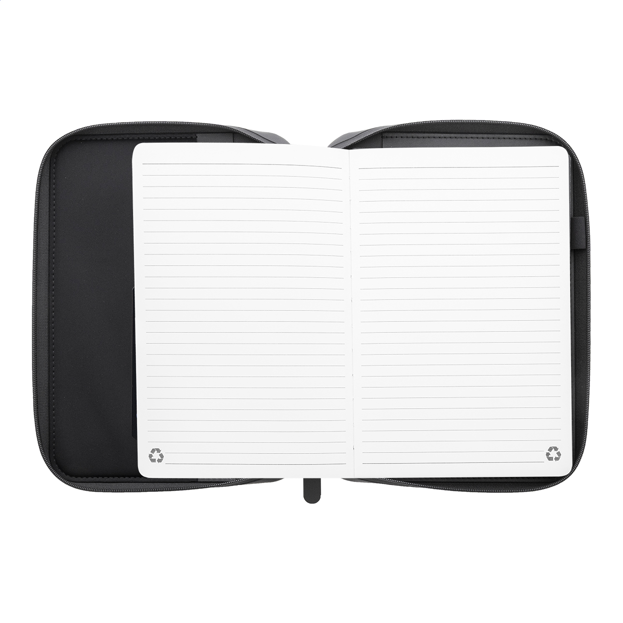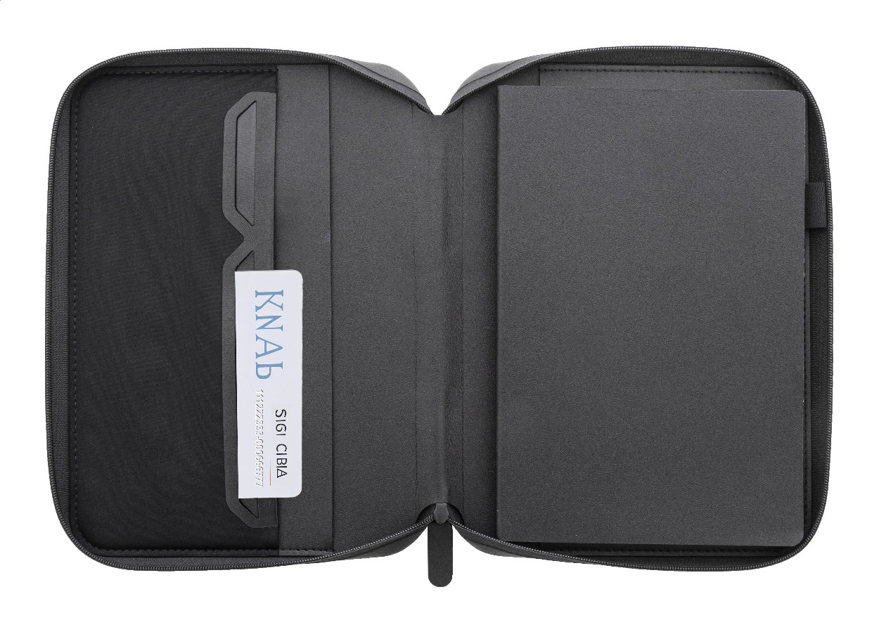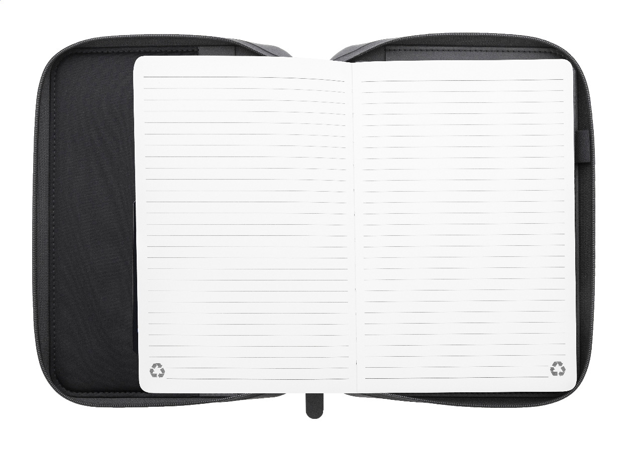 Luxusní složka na dokumenty A5 na zip z recyklované umělé kůže s 64 linkovanými listy a blokem z recyklovaného papíru. S několika vnitřními kapsami na karty a dokumenty.