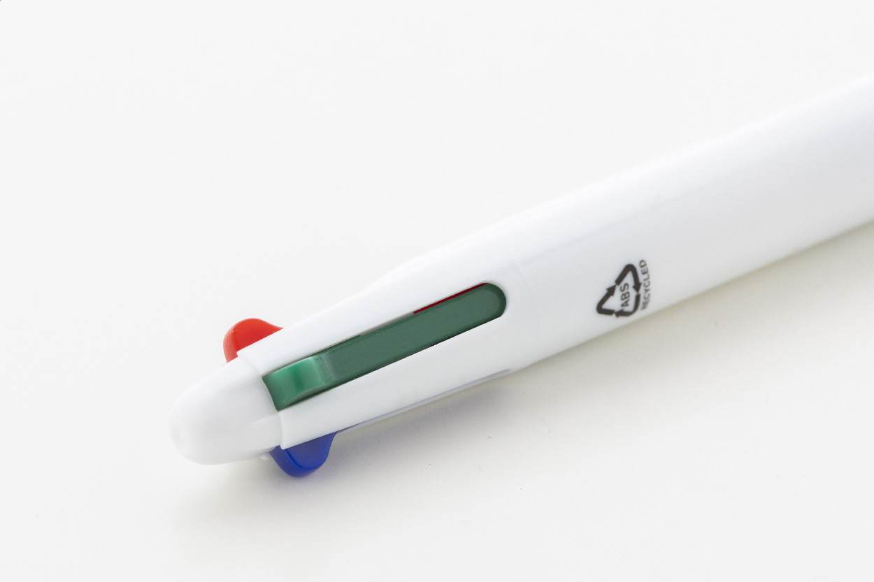 Vícebarevné kuličkové pero z recyklovaného ABS materiálu s gumovým úchopem. S černou, modrou, červenou a zelenou náplní.