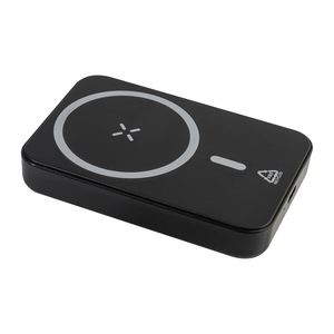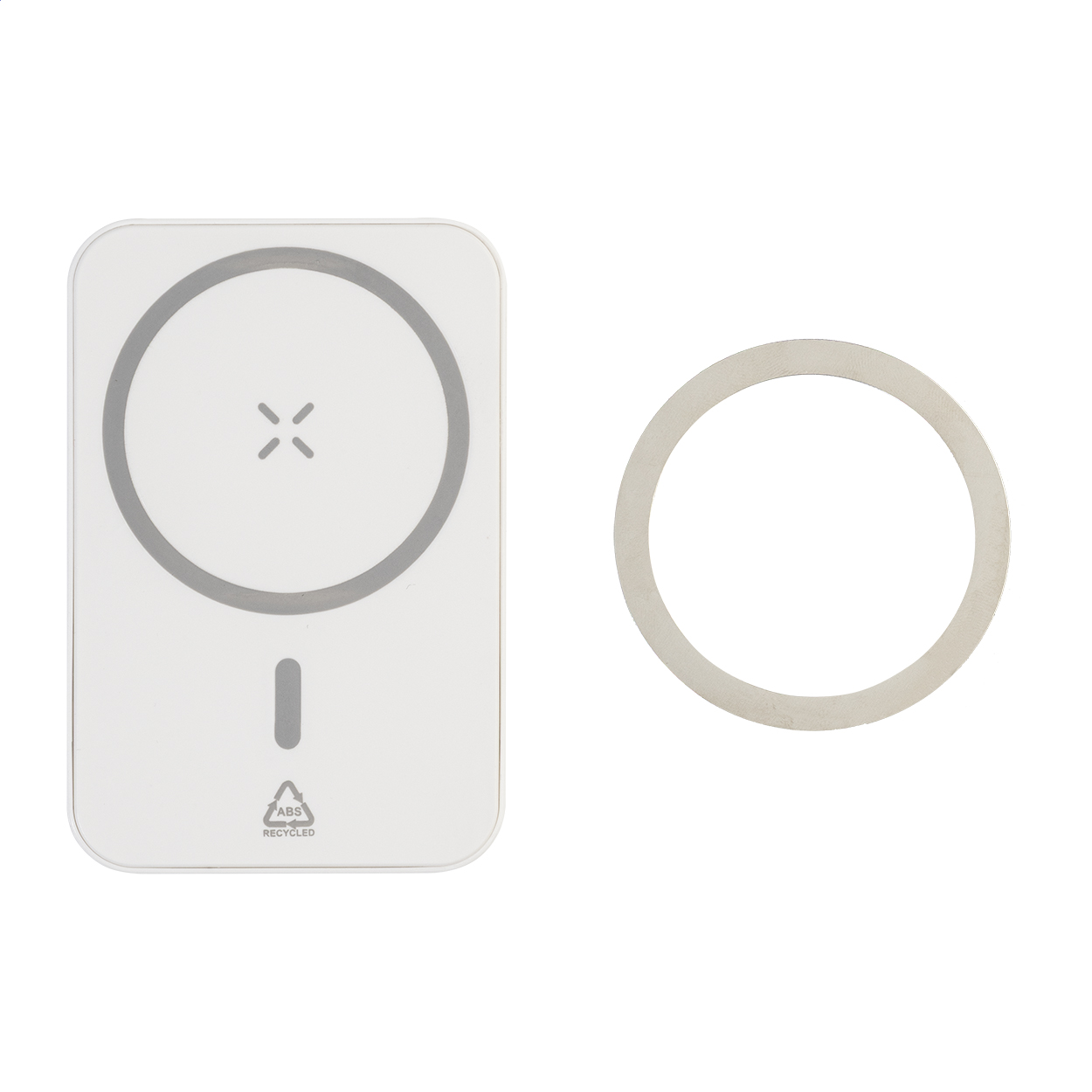 Power banka z recyklovaného ABS s baterií 5000 mAh a vestavěnou magnetickou bezdrátovou rychlonabíječkou (15 W). S USB-C vstupem a nabíjecím portem. Včetně samolepicího kovového kroužku pro použití magnetické funkce na jakémkoli bezdrátově nabíjecím zařízení. Kompatibilní s iPhone® 12 nebo novějším. Včetně nabíjecího kabelu USB.