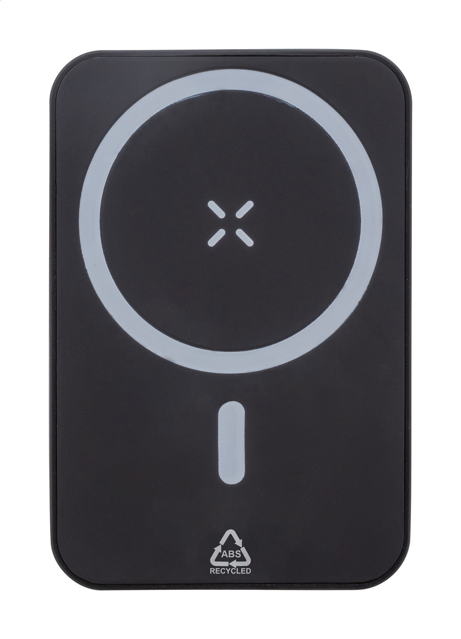 Power banka z recyklovaného ABS s 5000 mAh baterií a vestavěnou magnetickou bezdrátovou nabíječkou (5W). Se vstupem USB-C a portem pro nabíječku. Včetně samolepícího kovového kroužku pro použití magnetické funkce na jakémkoli bezdrátově nabíjecím zařízení. Kompatibilní s iPhone® 12 nebo novějším. Včetně USB nabíjecího kabelu.