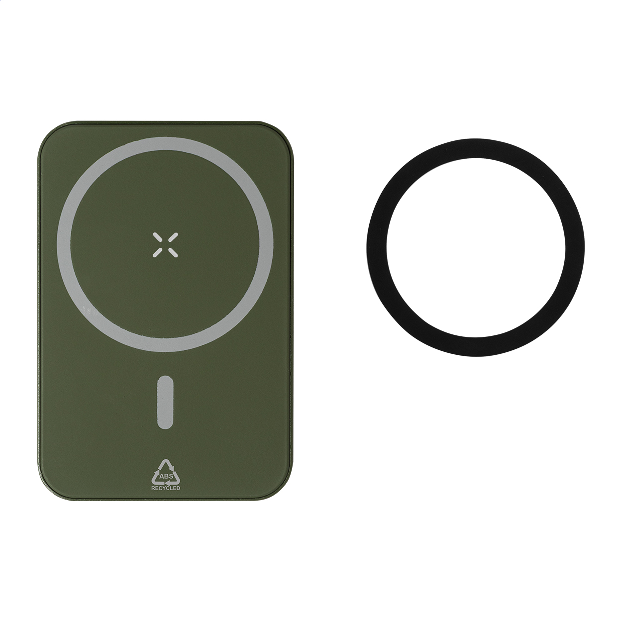 Power banka z recyklovaného ABS s 5000 mAh baterií a vestavěnou magnetickou bezdrátovou nabíječkou (5W). Se vstupem USB-C a portem pro nabíječku. Včetně samolepícího kovového kroužku pro použití magnetické funkce na jakémkoli bezdrátově nabíjecím zařízení. Kompatibilní s iPhone® 12 nebo novějším. Včetně USB nabíjecího kabelu.