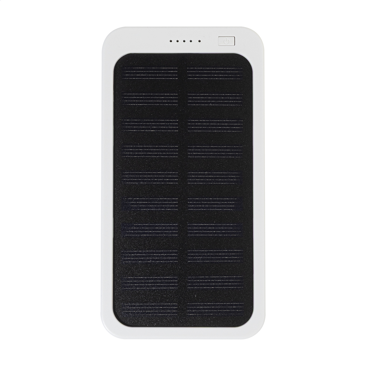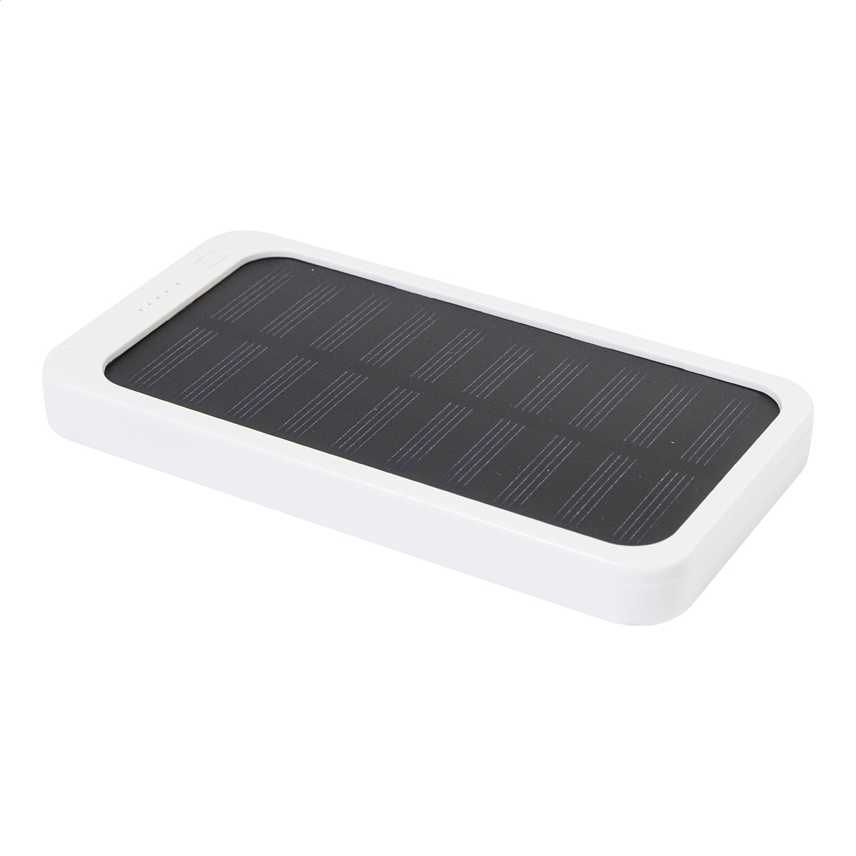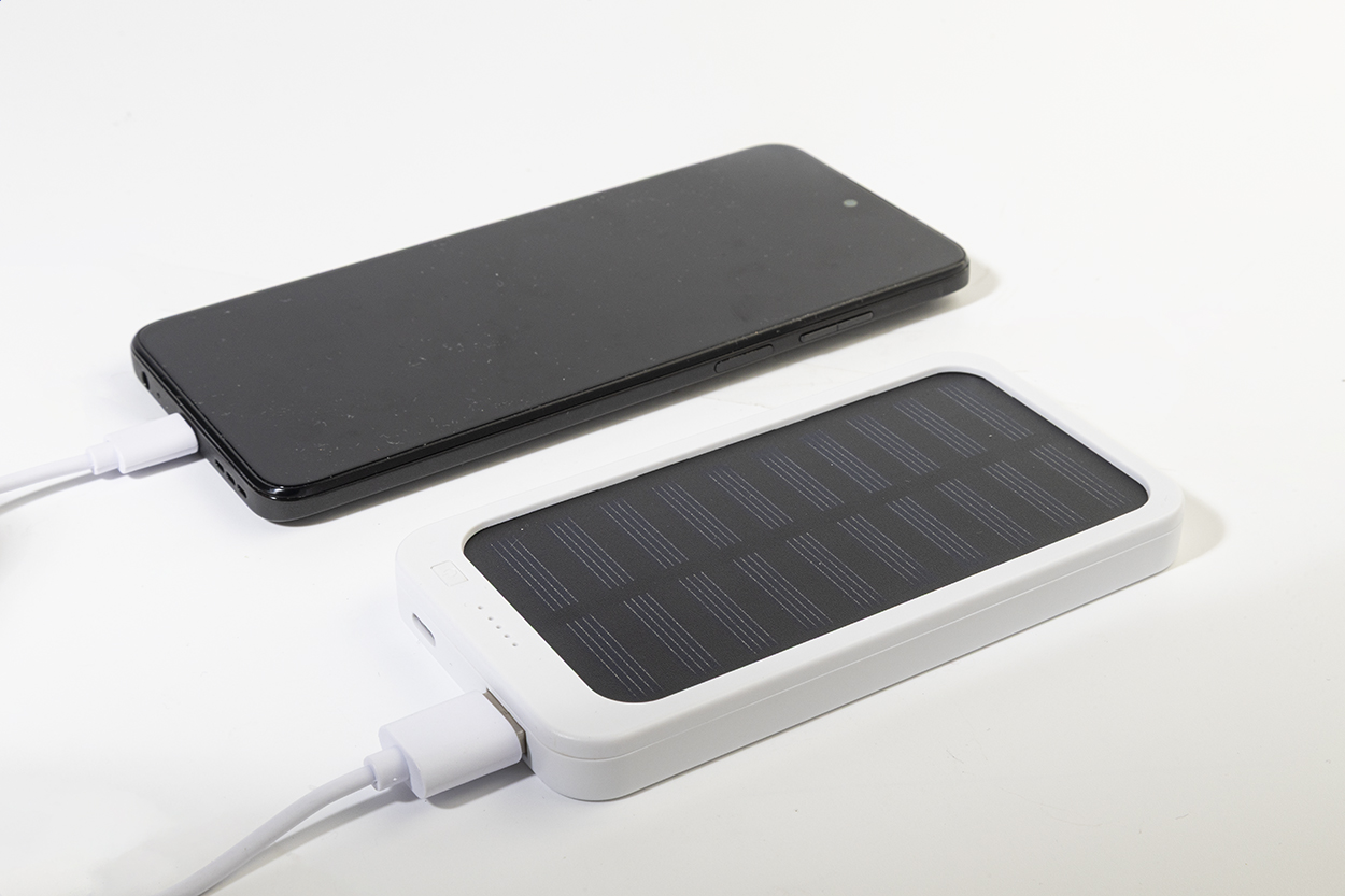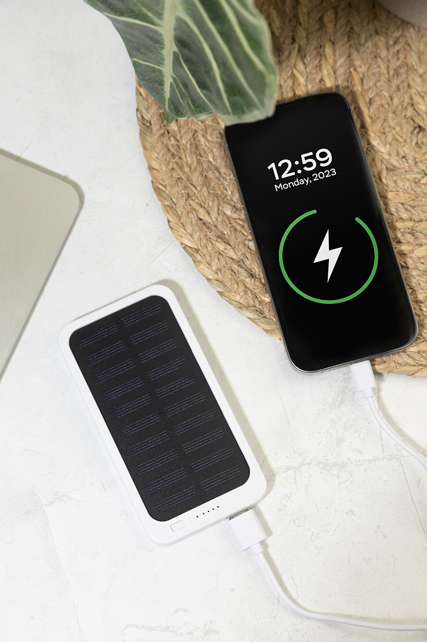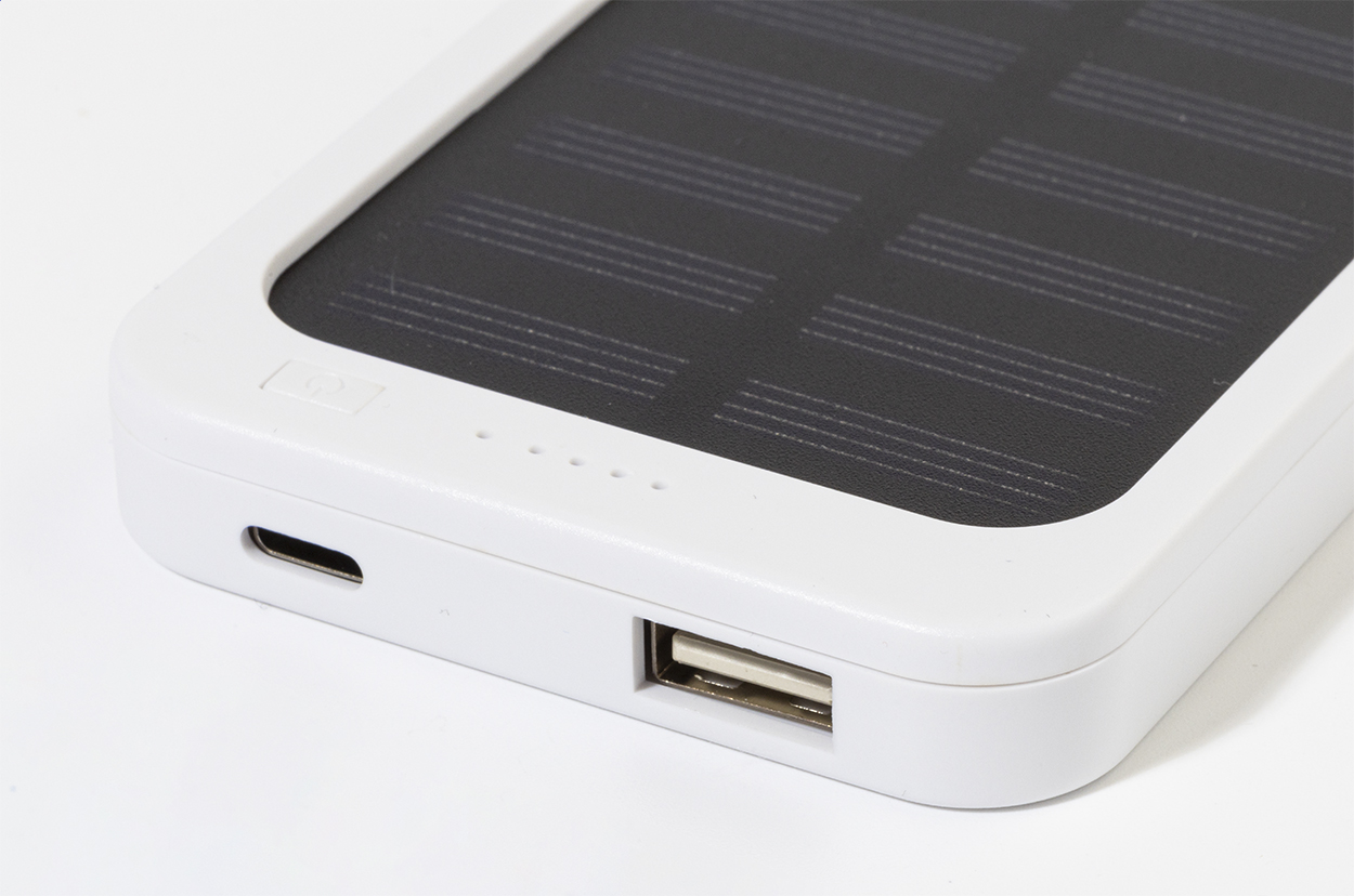 Power banka z recyklovaného ABS plastu s vestavěnou solární nabíječkou a baterií 4000 mAh. S 1 USB a 1 USB-C portem pro nabíjení. Vstupní port USB-C. Včetně nabíjecího kabelu USB.
