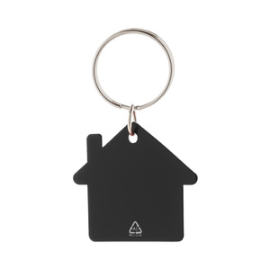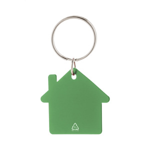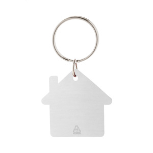 Přívěšek na klíče ve tvaru domečku z recyklovaného hliníku s kovovým kroužkem.