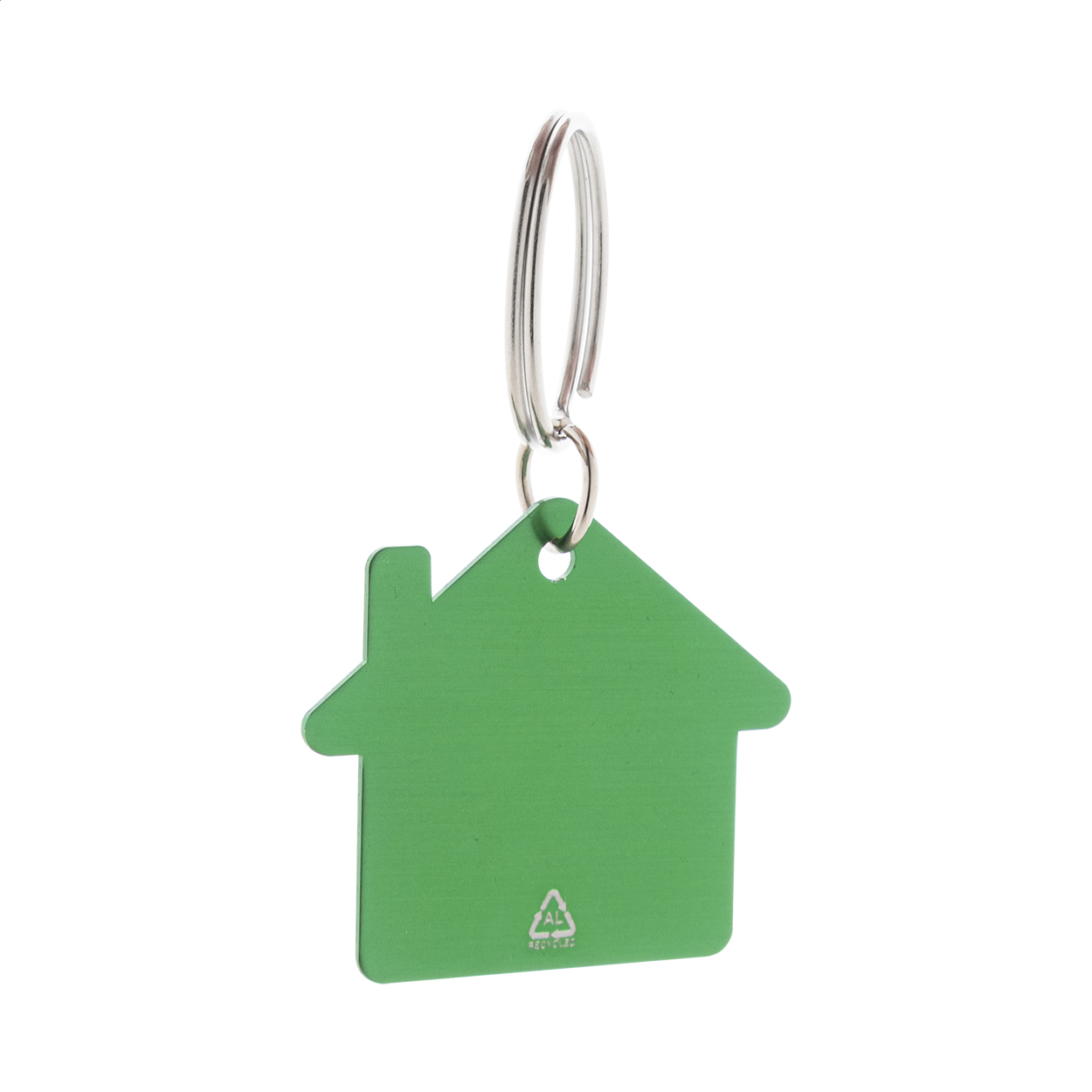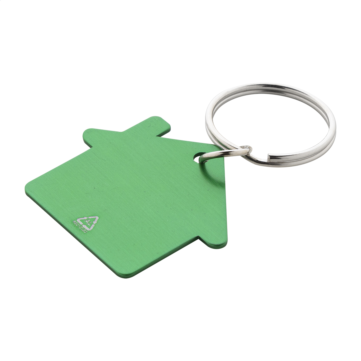Přívěšek na klíče ve tvaru domečku z recyklovaného hliníku s kovovým kroužkem.