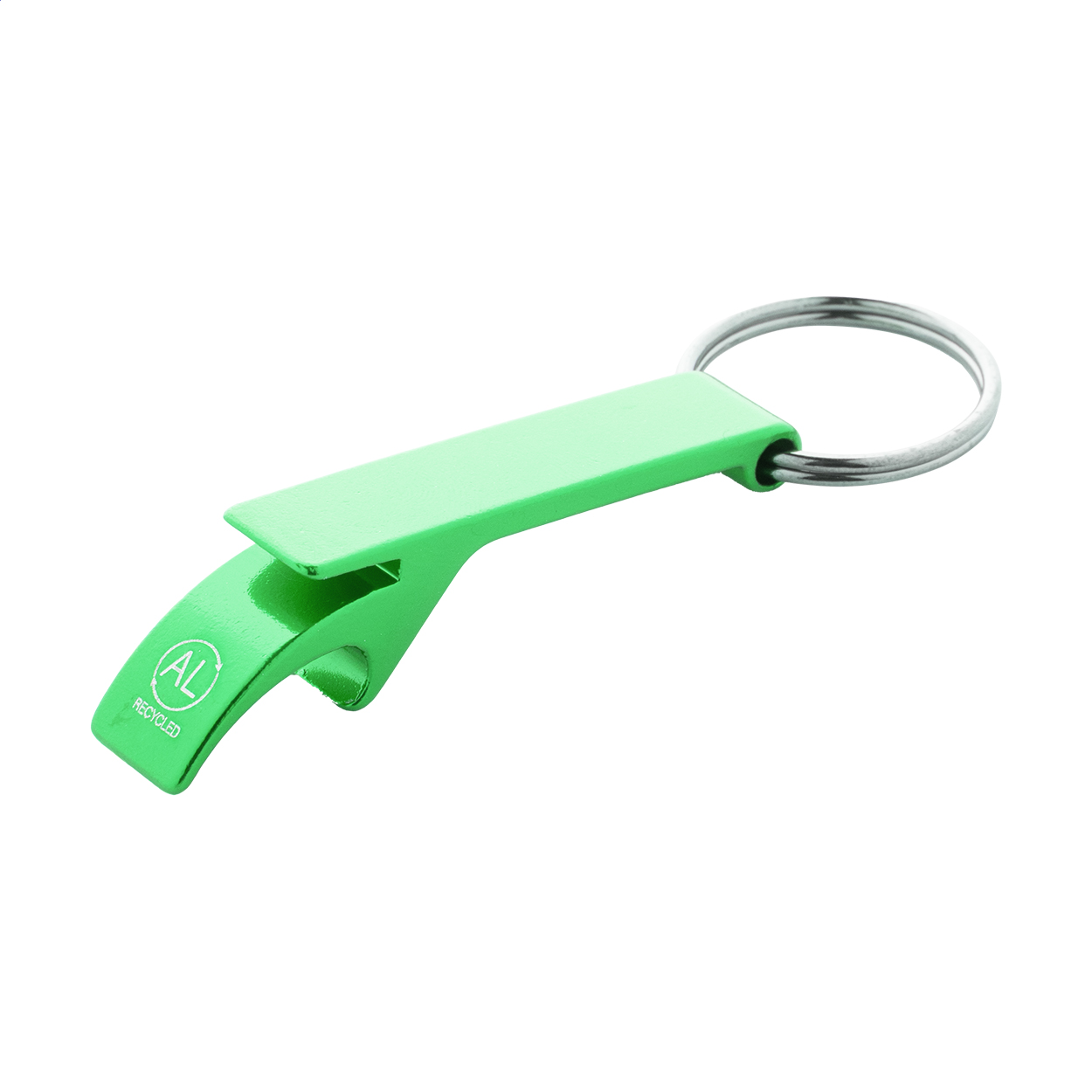 Otvírák na láhve a plechovky z recyklovaného hliníku s kovovým kroužkem na klíče.