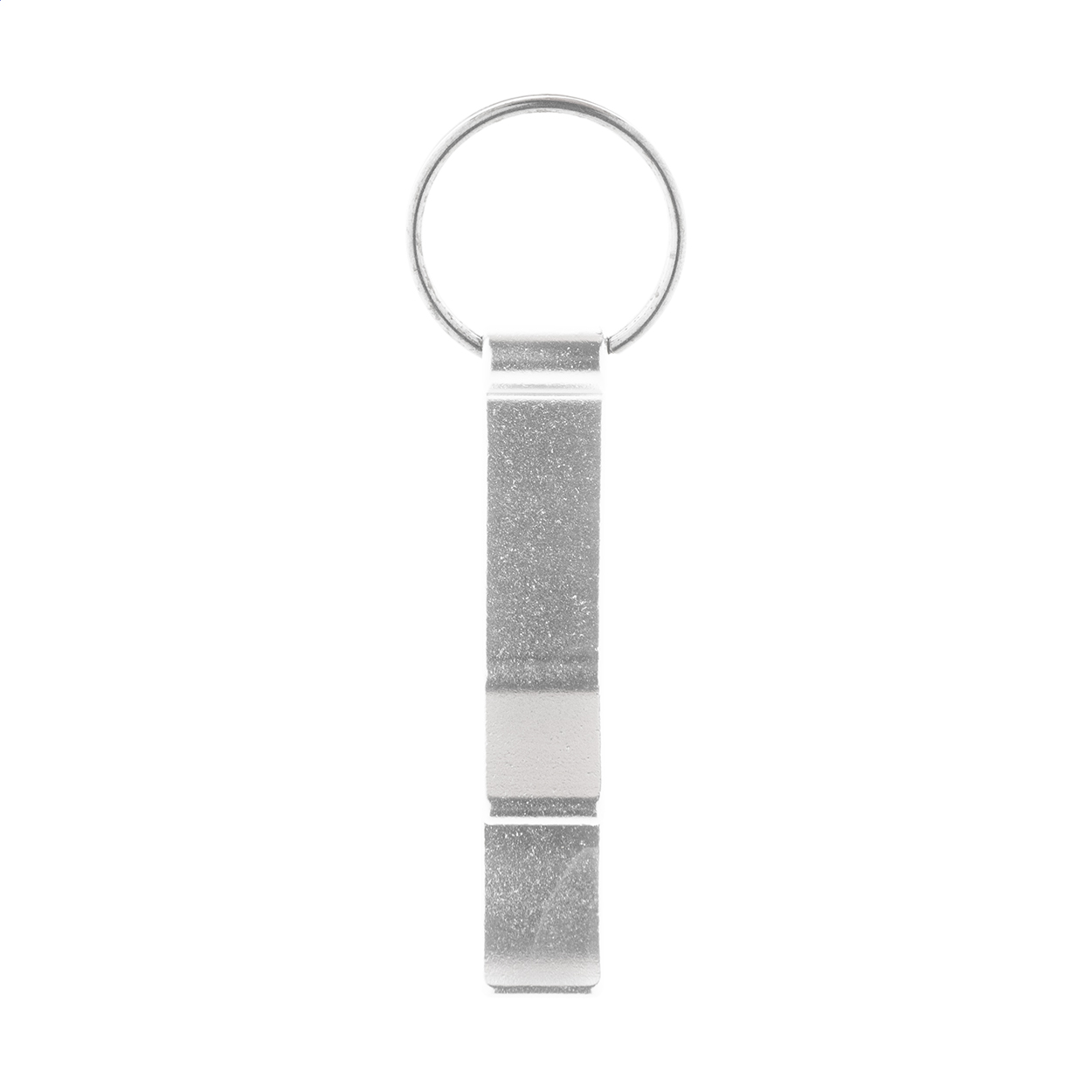 Otvírák na láhve a plechovky z recyklovaného hliníku s kovovým kroužkem na klíče.