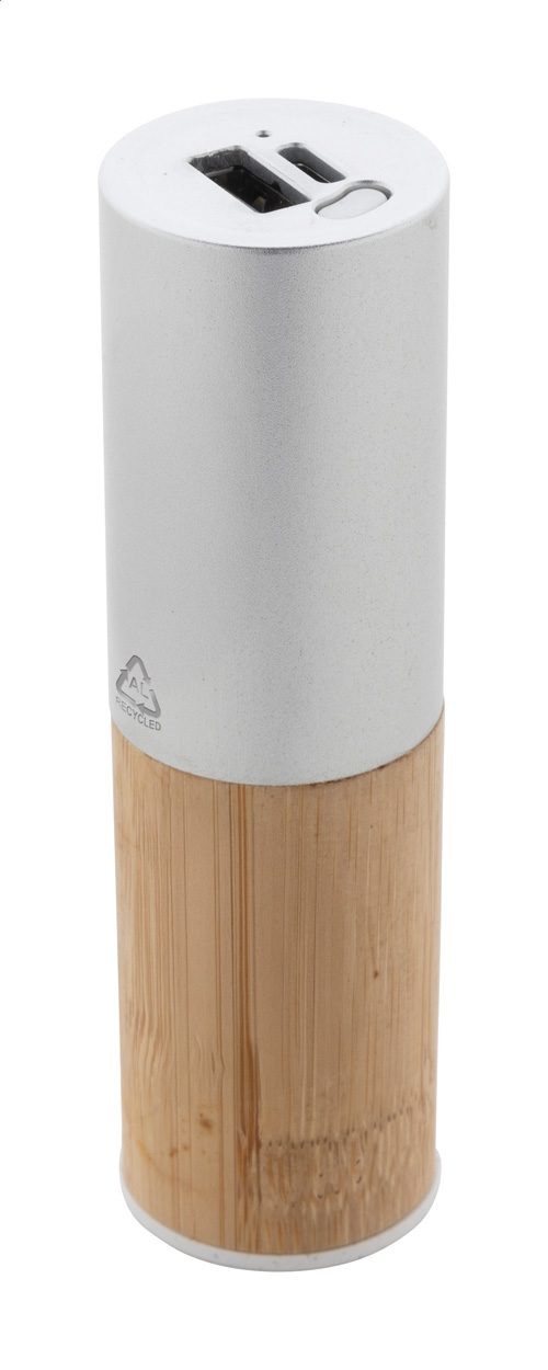 Power banka z recyklovaného hliníku a bambusu s baterií 2600 mAh. S 1 portem USB a 1 portem USB-C pro nabíječku. Vstupní port USB-C. Včetně USB nabíjecího kabelu.