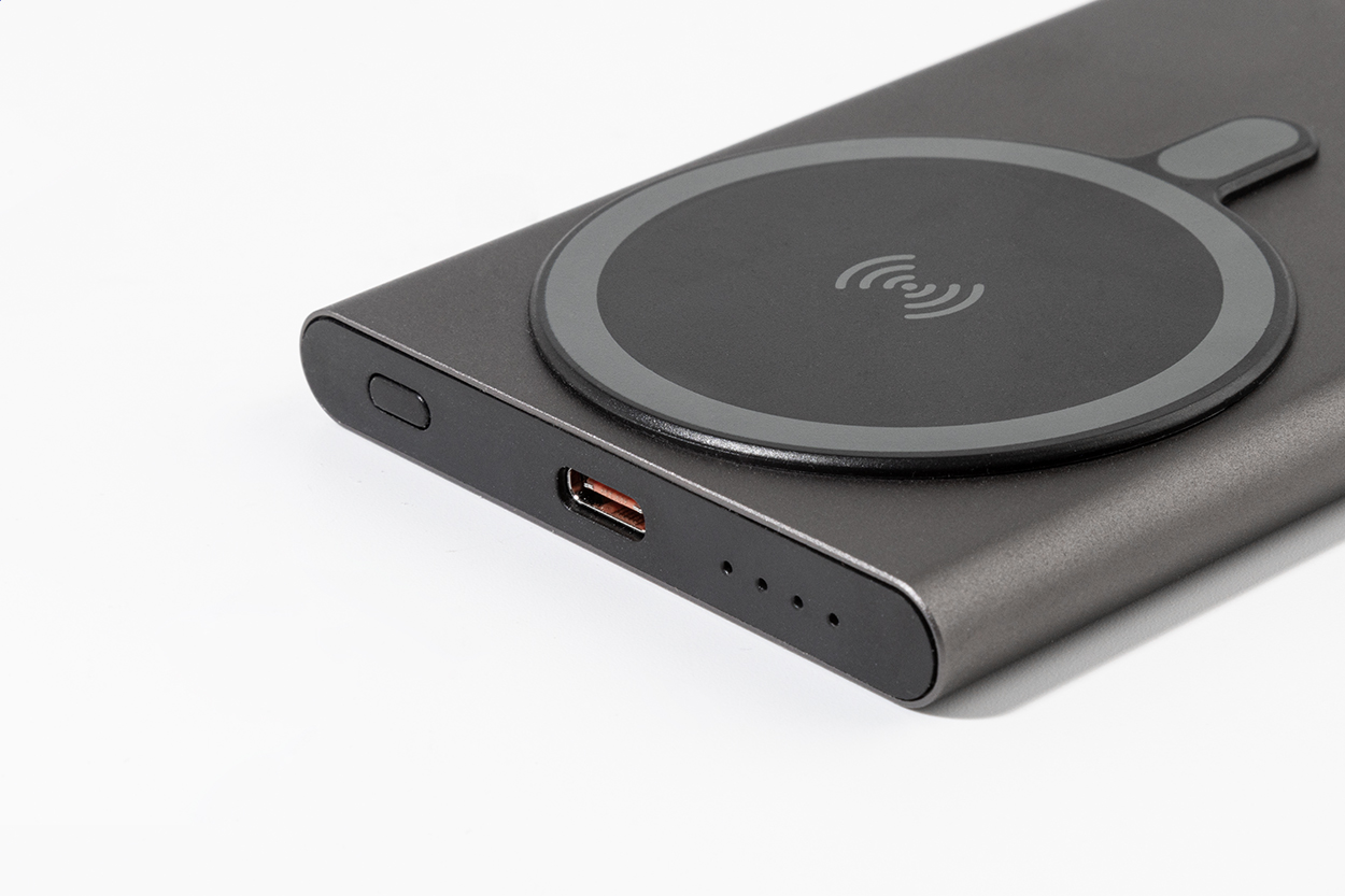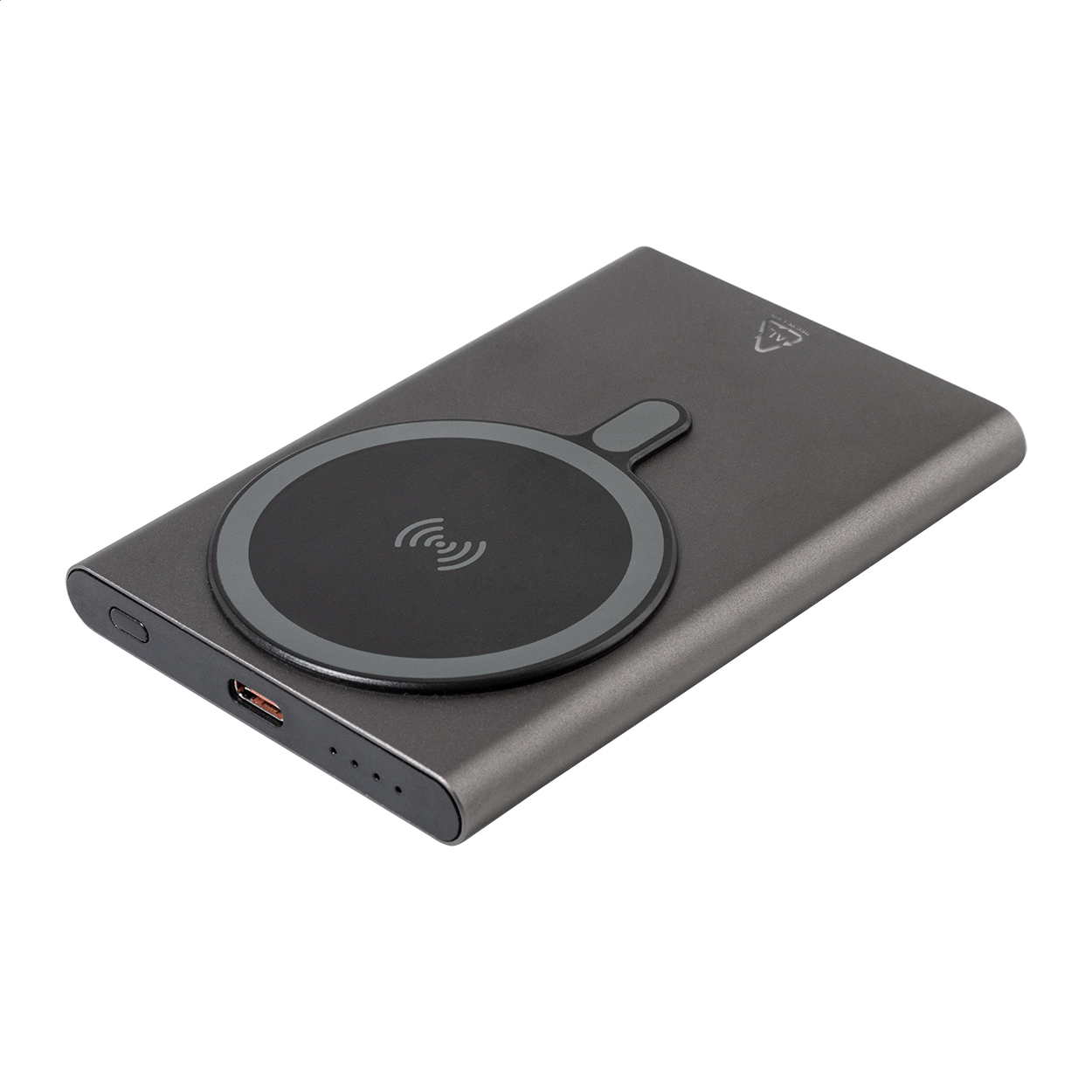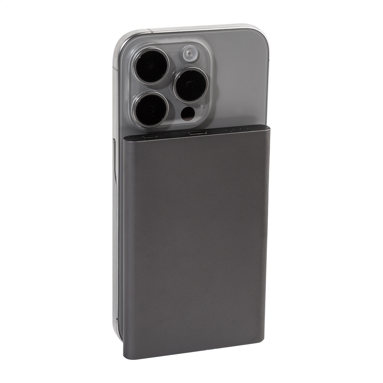 Power banka z recyklovaného hliníku s vestavěnou magnetickou bezdrátovou rychlonabíječkou (15 W) a 5000 mAh baterií. Se vstupem USB-C a portem pro nabíječku. Obsahuje samolepicí kovový kroužek pro použití magnetické funkce na jakémkoli bezdrátovém nabíjecím zařízení. Kompatibilní s iPhone® 12 nebo novějším. USB nabíjecí kabel součástí.