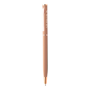 Kuličkové pero z recyklovaného hliníku s pogumovaným povrchem a detaily z růžového zlata. Se speciální povrchovou úpravou pro zrcadlové laserové gravírování v barvě růžového zlata. S modrou náplní.