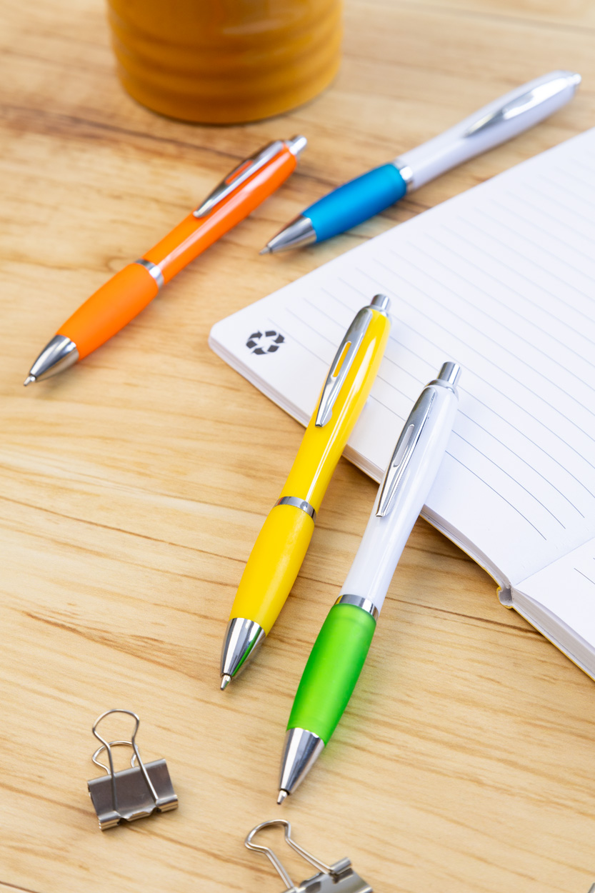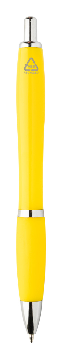 Kuličkové pero z recyklovaného ABS plastu s úchopem v odpovídající barvě a chromovanými částmi. S modrou náplní.