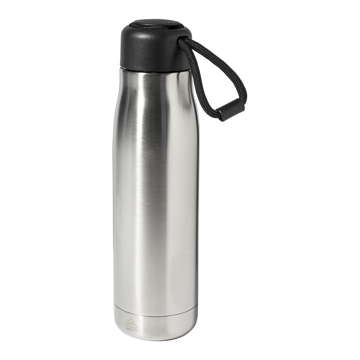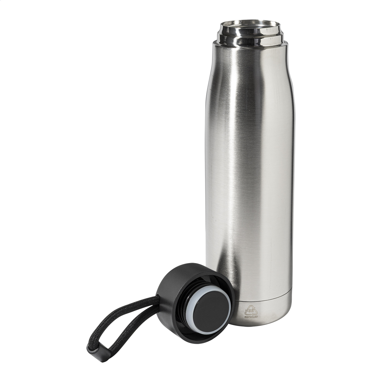 Dvoustěnná, vakuově izolovaná láhev z recyklované nerezové oceli s PP víčkem a integrovaným poutkem na nošení se šňůrkou. 500 ml.