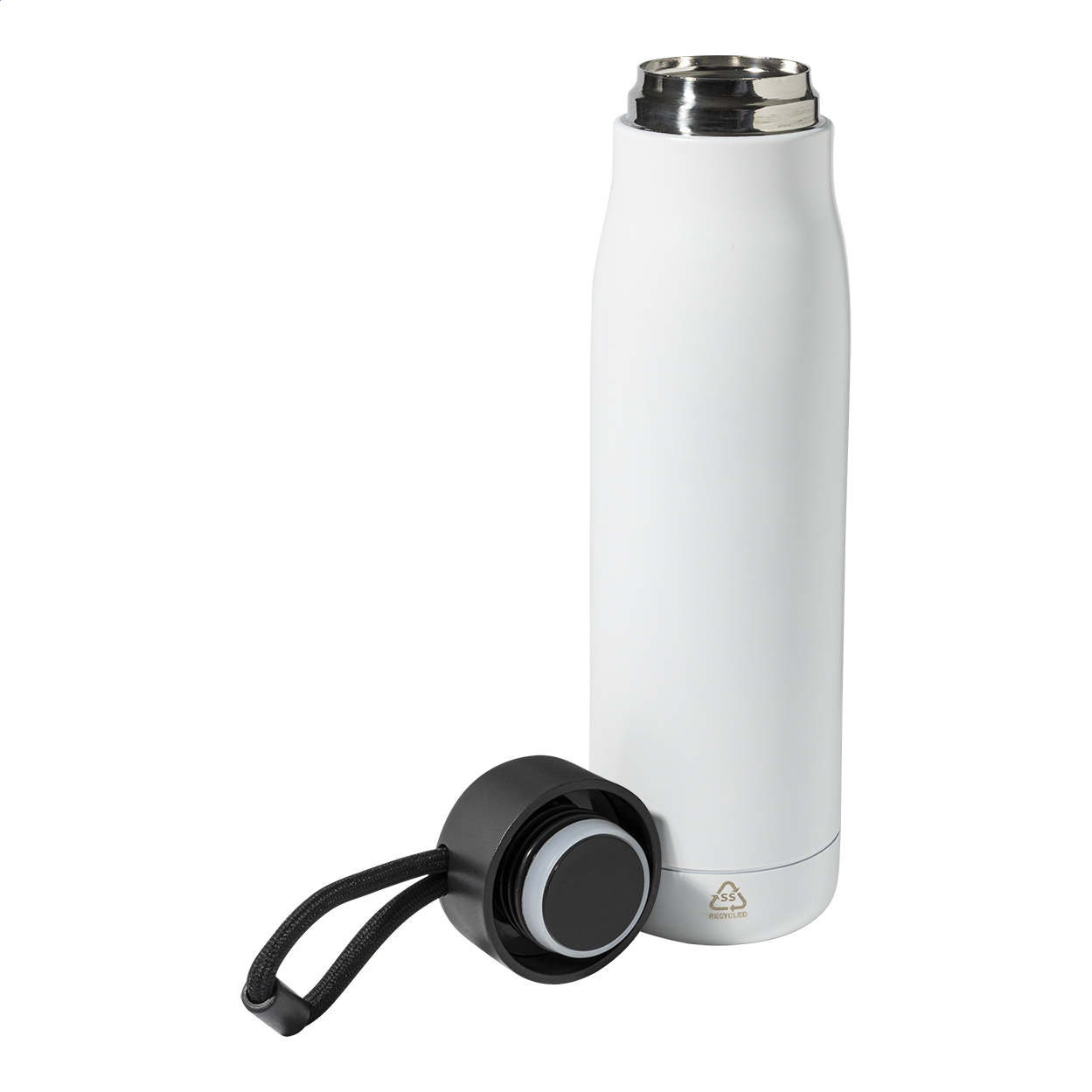 Dvoustěnná, vakuově izolovaná láhev z recyklované nerezové oceli s PP víčkem a integrovaným poutkem na nošení se šňůrkou. 500 ml.