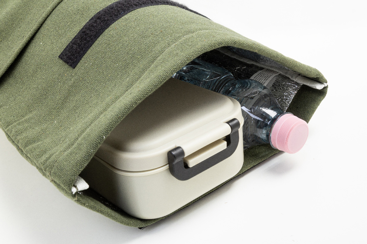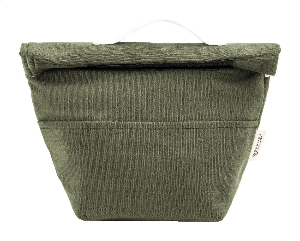 Chladicí taška z recyklovaného plátna s rolovacím vrškem, přední kapsou, hliníkovou výplní a zapínáním na suchý zip. 70 % recyklované bavlny a 30 % RPET polyesteru. S výrazným štítkem recyklované bavlny.