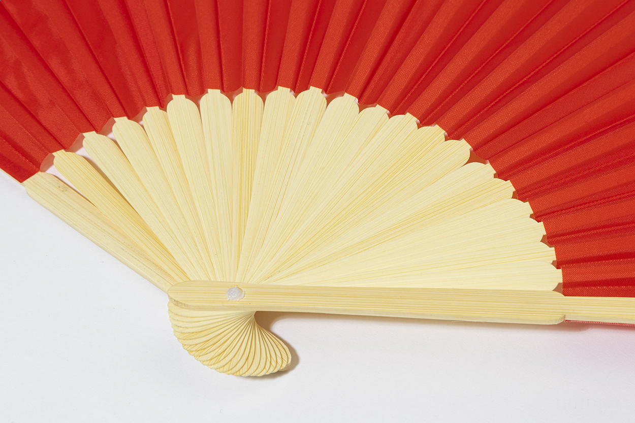 Vějíř z RPET polyesteru s bambusovými žebry.