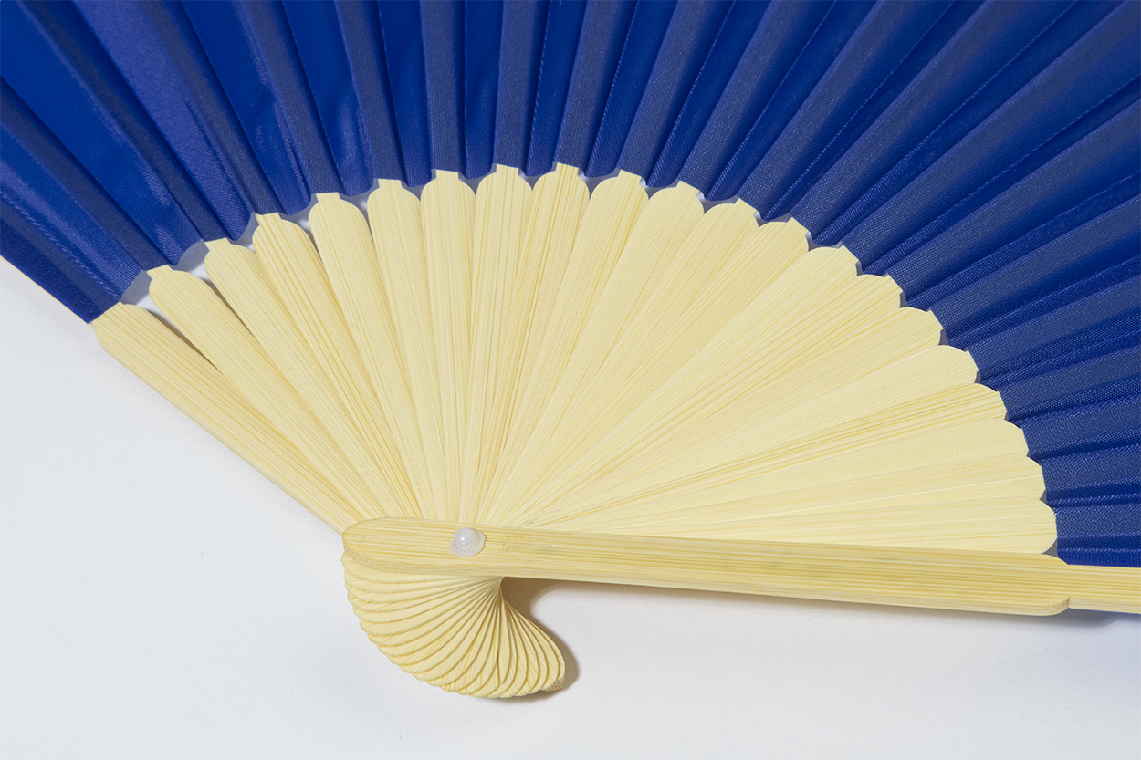 Vějíř z RPET polyesteru s bambusovými žebry.
