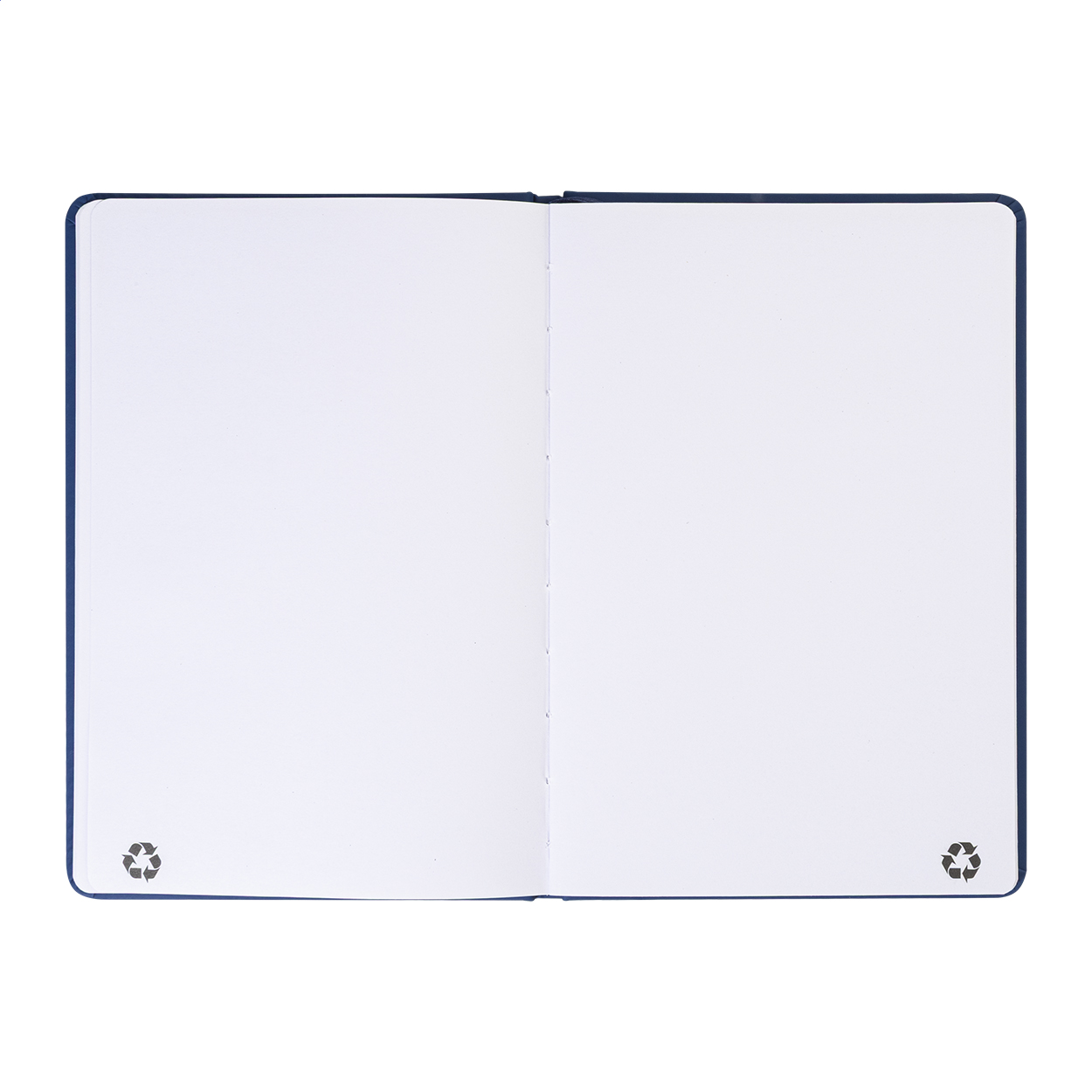 Blok A5 z recyklované PU kůže se 100 čistými listy z recyklovaného papíru. Se záložkou v odpovídající barvě a gumičkou.