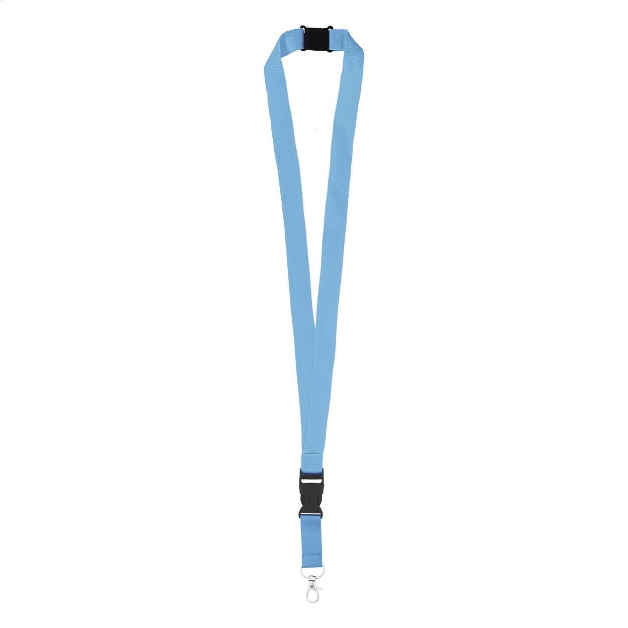 Polyesterový lanyard RPET s odnímatelnou kovovou karabinou a bezpečnostní přezkou.