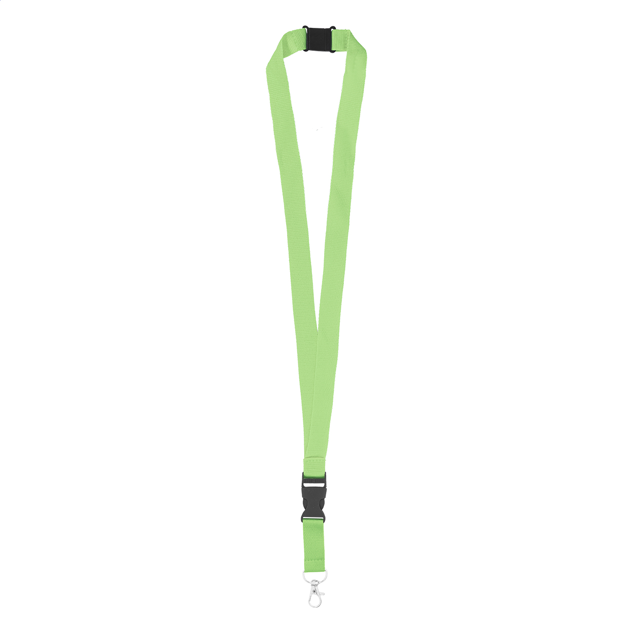 Polyesterový lanyard RPET s odnímatelnou kovovou karabinou a bezpečnostní přezkou.