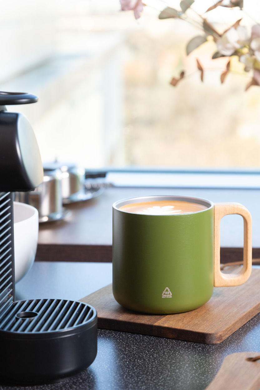 Dvoustěnný termo hrnek z recyklované nerezové oceli s dřevěným uchem. 350 ml.