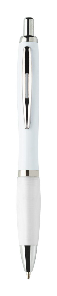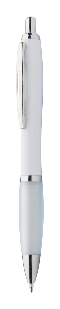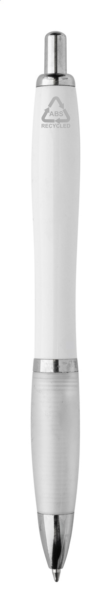 Kuličkové pero z recyklovaného ABS plastu s bílým tělem, barevným úchopem a chromovanými částmi. S modrou náplní.