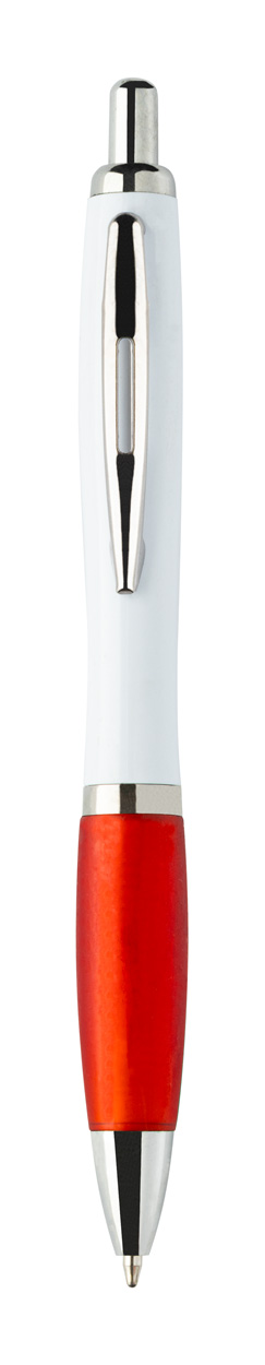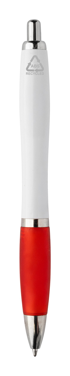 Kuličkové pero z recyklovaného ABS plastu s bílým tělem, barevným úchopem a chromovanými částmi. S modrou náplní.