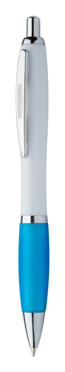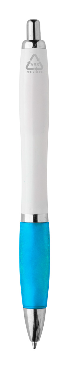 Kuličkové pero z recyklovaného ABS plastu s bílým tělem, barevným úchopem a chromovanými částmi. S modrou náplní.