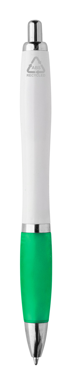 Kuličkové pero z recyklovaného ABS plastu s bílým tělem, barevným úchopem a chromovanými částmi. S modrou náplní.