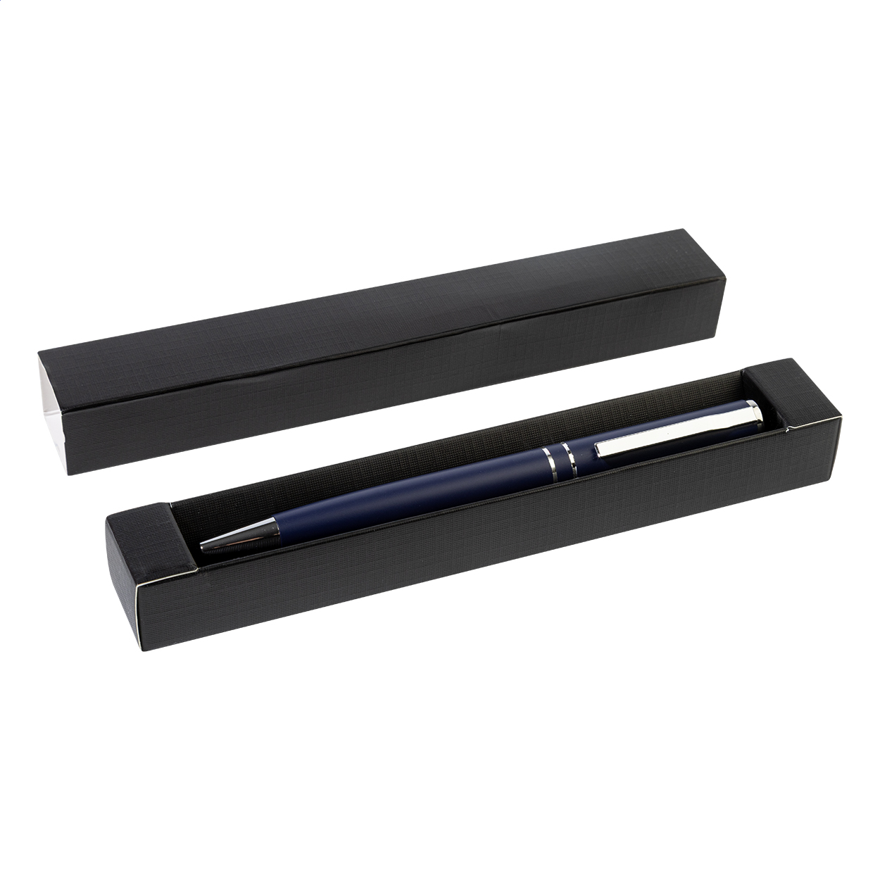 Kuličkové pero z recyklovaného hliníku s chromovanými částmi a kroužky. V černé dárkové krabičce. S modrou náplní.