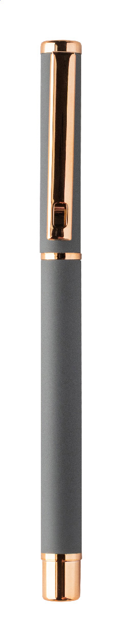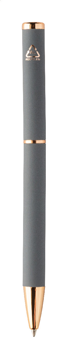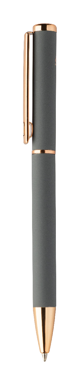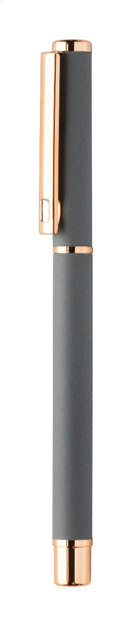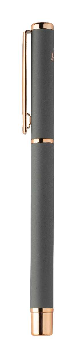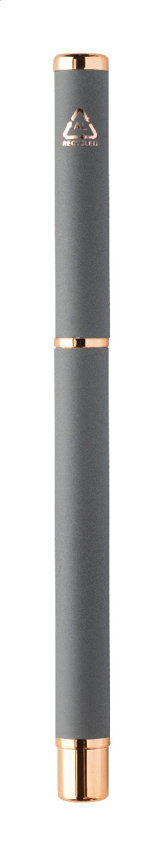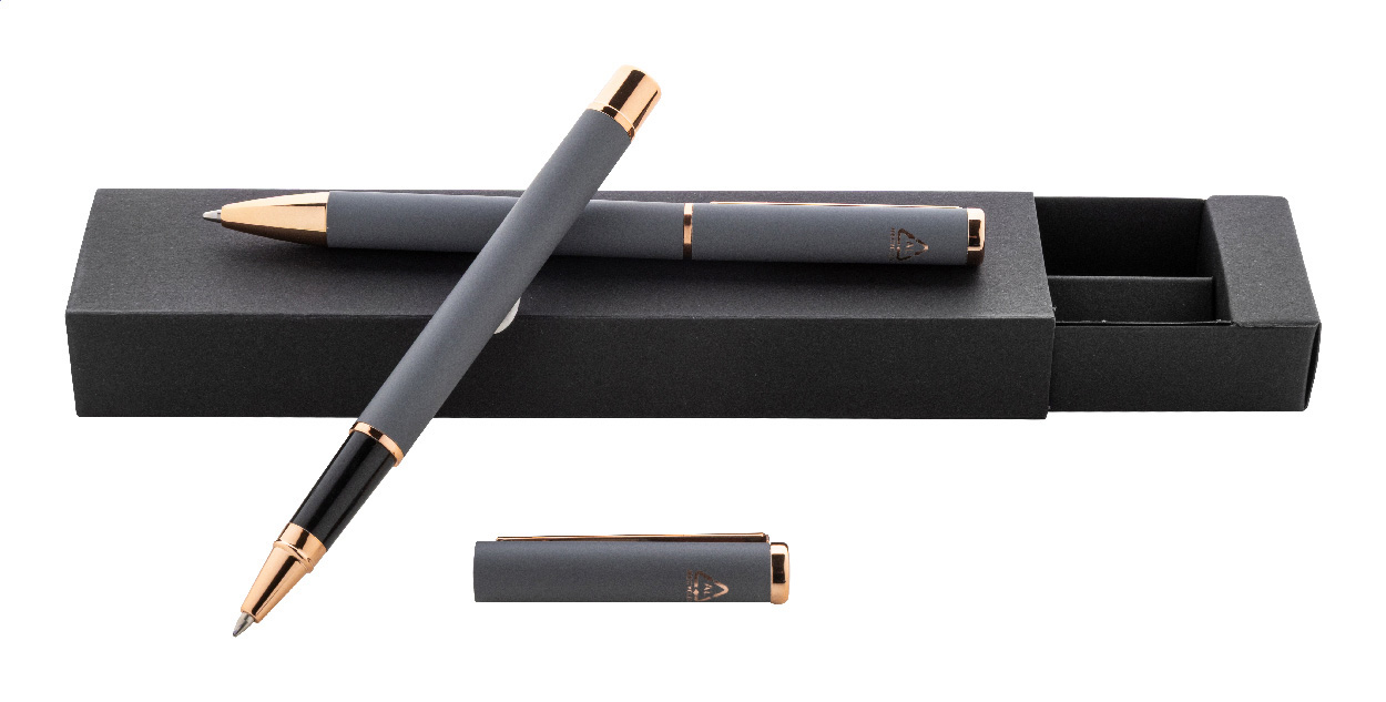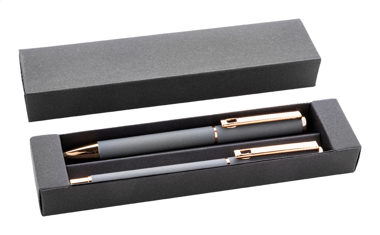 Sada per z recyklovaného hliníku s kuličkovým perem a rollerem s pogumovaným povrchem a detaily růžového zlata. S modrou náplní. Se speciálním povrchem pro zrcadlové laserové gravírování v růžovo-zlaté barvě. V černé papírové dárkové krabičce.