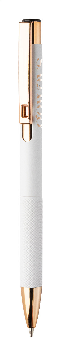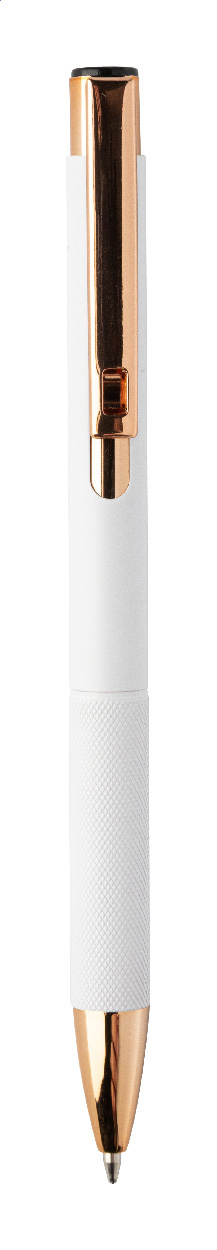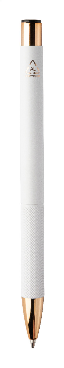 Kuličkové pero z recyklovaného hliníku s matným tělem, texturovaným úchopem a detaily růžového zlata. Se speciálním povrchem pro zrcadlové laserové gravírování v barvě růžového zlata. S modrou náplní.