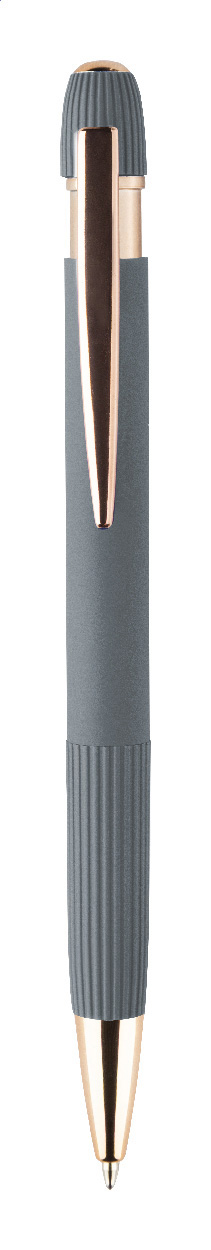 Kuličkové pero z recyklovaného hliníku s pogumovaným tělem a detaily v růžovo-zlaté barvě. Se speciálním povlakem pro zrcadlové laserové gravírování v růžovo-zlaté barvě. S modrou náplní.