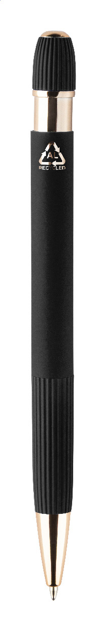 Kuličkové pero z recyklovaného hliníku s pogumovaným tělem a detaily v růžovo-zlaté barvě. Se speciálním povlakem pro zrcadlové laserové gravírování v růžovo-zlaté barvě. S modrou náplní.