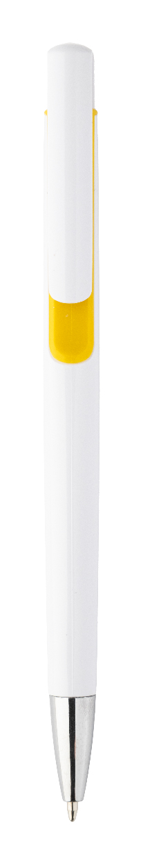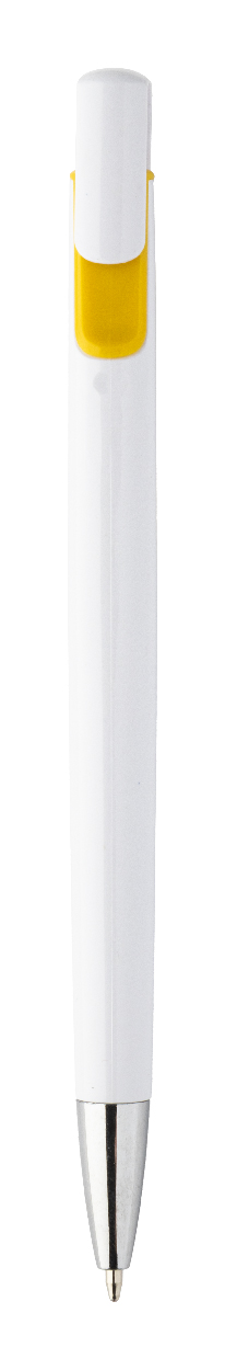Plastové kuličkové pero s barevnými doplňky a chromovou špičkou. Dodáváno s modrou náplní.