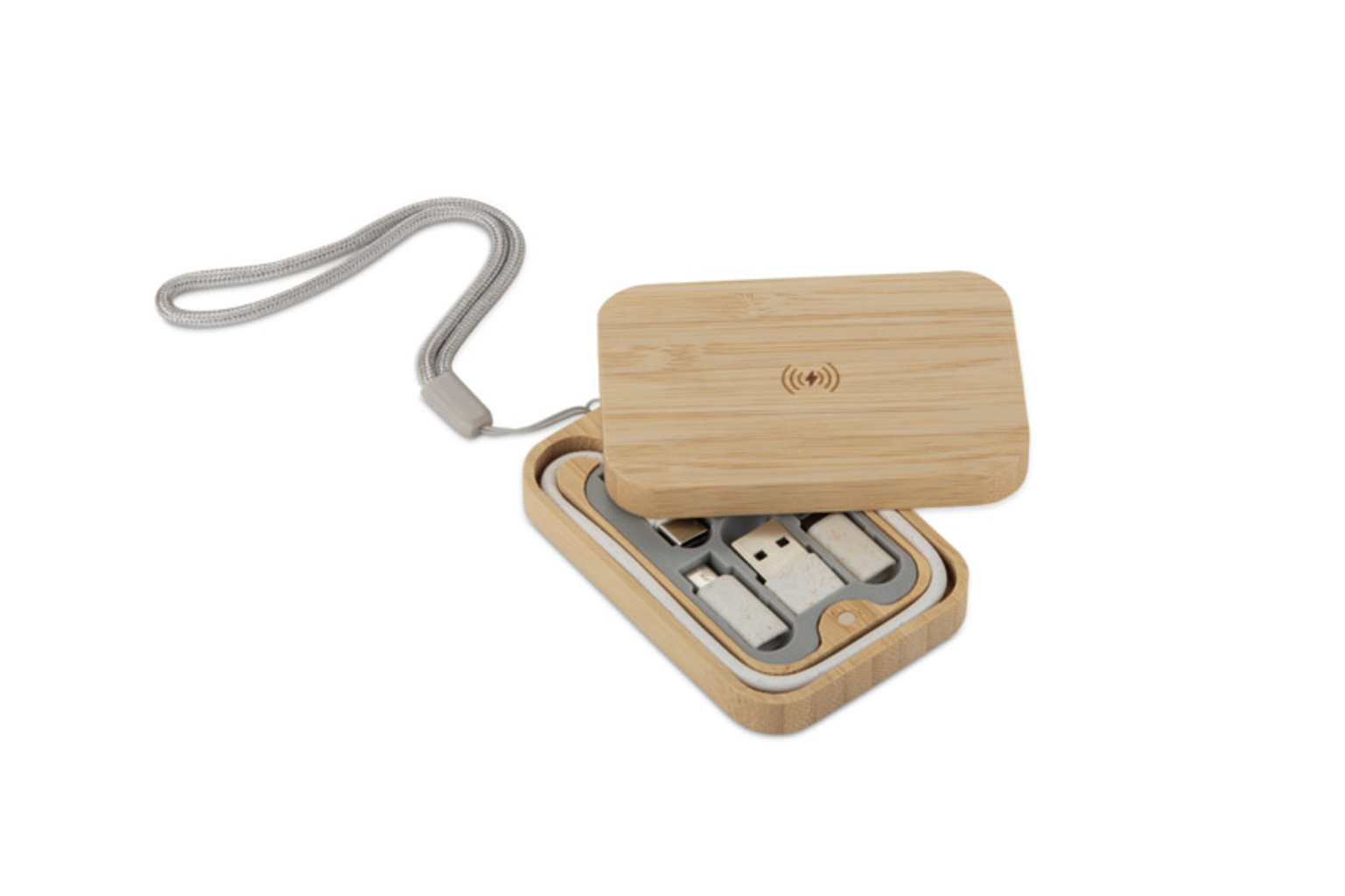 Sada kabelů BUMO je praktické a multifunkční nabíjecí příslušenství v estetickém bambusovém pouzdře. Kromě klasických kabelů je sada vybavena funkcí bezdrátové nabíječky Qi s výkonem 10 W pro pohodlné napájení kompatibilních zařízení. Kabely vyrobené z plastu z pšeničné slámy nabízejí funkci nabíjení i přenosu dat s výkonem až 15 W pro rychlý provoz. Díky konektorům USB-C bude sada dobře fungovat s většinou moderních mobilních zařízení. Kompaktní pouzdro usnadňuje skladování a přepravu, takže je BUMO ideální pro každodenní použití v kanceláři i na cestách. Možnost brandingu z něj navíc dělá zajímavý propagační gadget s praktickým využitím.