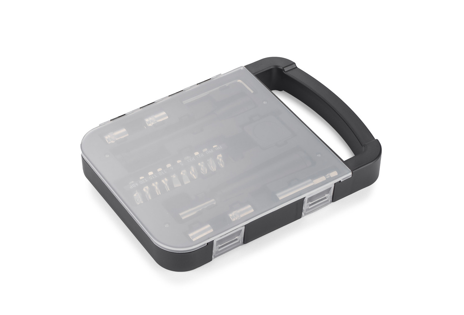 Sada nářadí FIXO v praktickém kufříku. Uvnitř se nachází: imbusový klíč, svítilna, svinovací metr, šroubovák, další různé bity, prodlužovací nástavec a čtyři nástrčné bity 7 mm, 8 mm, 9 mm a 10 mm.
