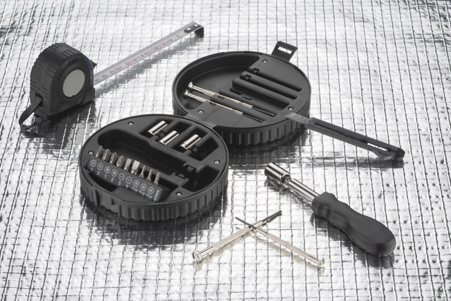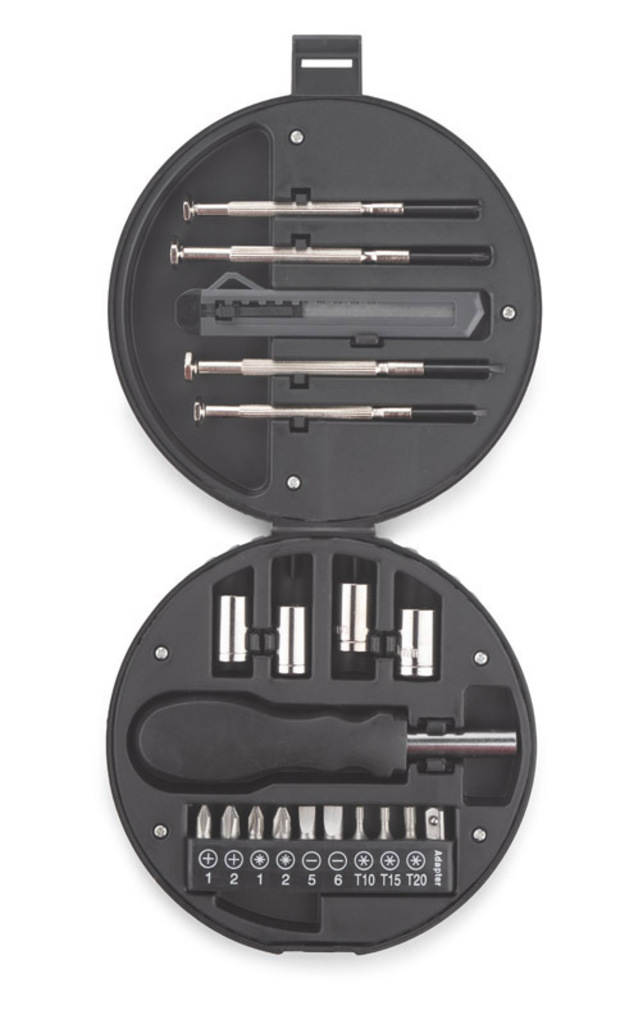 WHEEL je sada s mnoha užitečnými nástroji: čtyři přesné šroubováky, nůž na tapety, rukojeť, čtyři nástrčné klíče s adaptérem a devět bitů. Všechno je uzavřeno v charakteristickém případě ve tvaru kola automobilu.