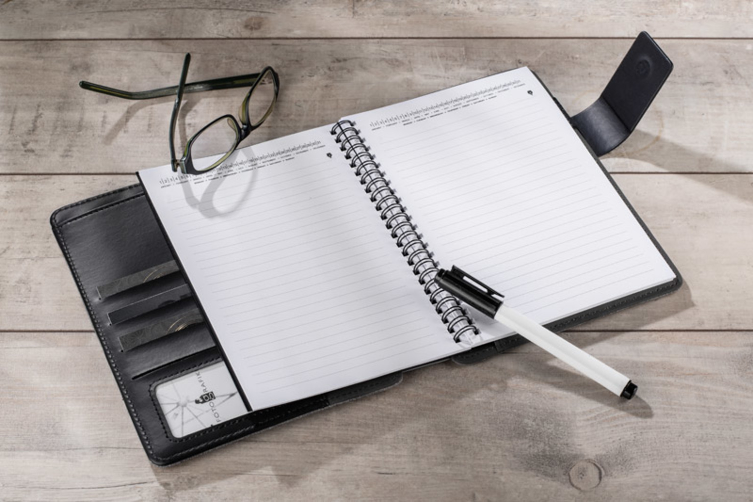 Vnější obal CARLIS folderu je vyroben z lnu a nabízí dvě kapsy pro váš telefon a USB paměť. Uvnitř najdete vyměnitelný A5 sešit (50 linkovaných listů), velkou zipovou kapsu, držák na pero a čtyři malé kapsy, včetně jedné s oknem. Folder je uzamčen magnetickým klipem. Klip má kovovou značku, která umožňuje úžasnou gravírování, které jistě zdůrazní elegantn