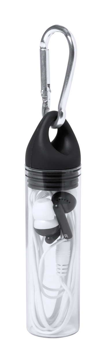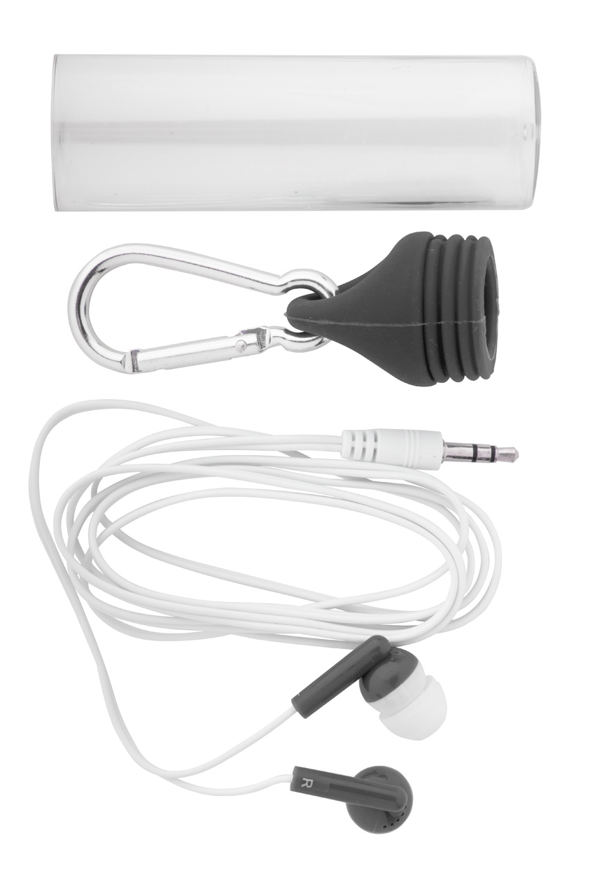 Sluchátka do uší s 3,5 mm audio Jackem, v plastové krabičce s karabinkou a stejně barevným vrškem.