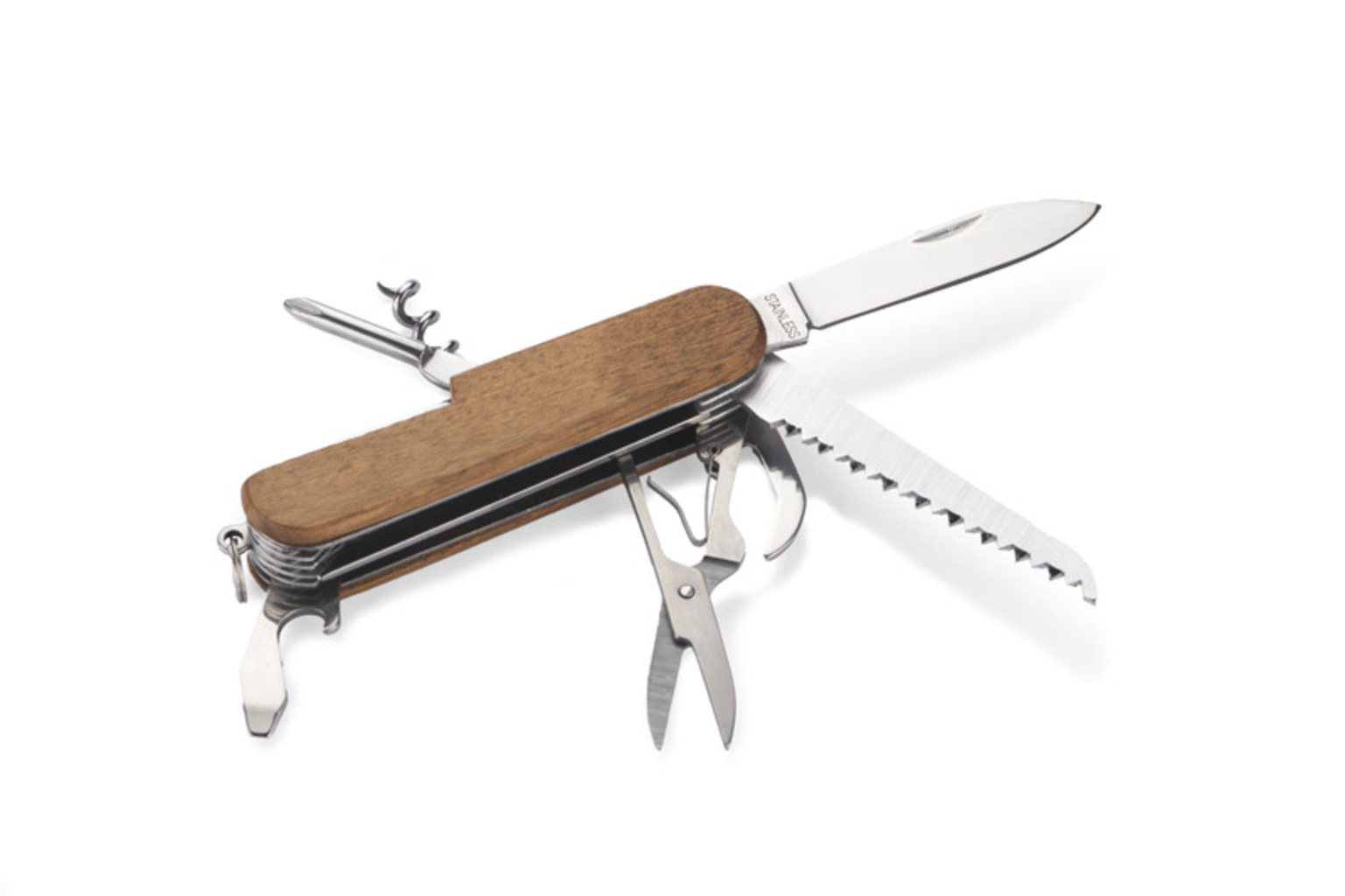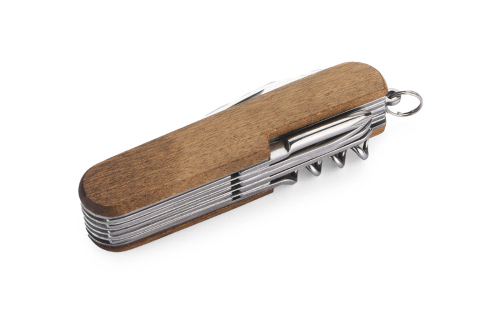Nůž s dřevěnou rukojetí - jedinečná charakteristika spojená s okouzlujícím vzhledem. Tento přístroj má všechny potřebné funkce: nůž, pila, rybí škrabka, nůžky, otevírák konzerv, otevírák lahví, šroubovák, otvírák na víno, hrot a vyřezávač kůže.
