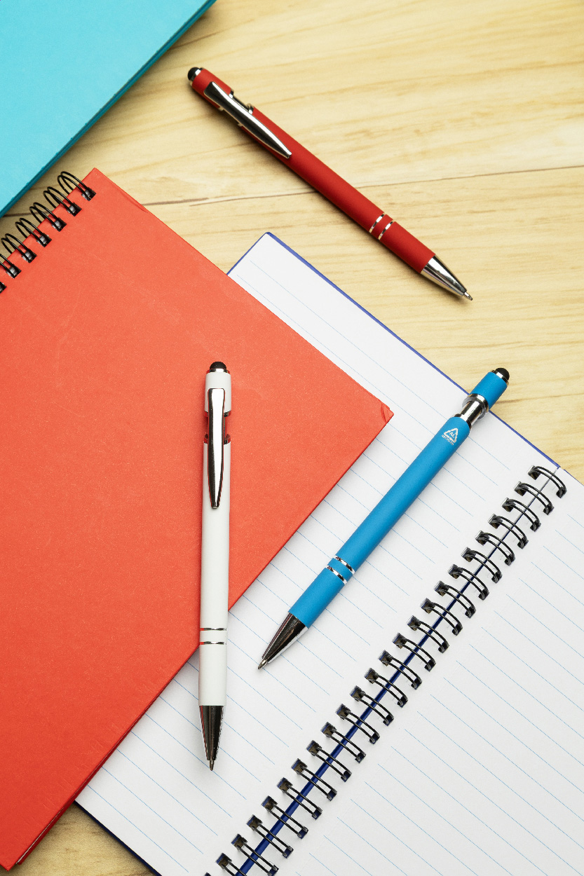 Kuličkové pero a pero pro dotykovou obrazovku z recyklovaného hliníku s pogumovaným tělem a chromovanými detaily. S modrou náplní.
